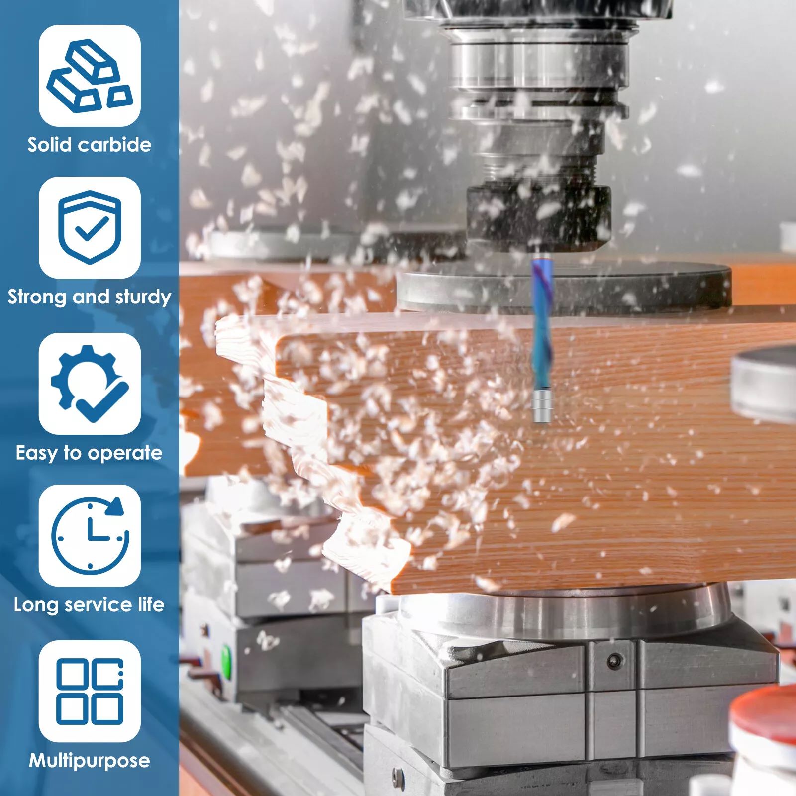 Compared to uncoated drill bits, this router bit's service life is extended by 2.5 times. It's compatible with CNC routers and any drop in router that accommodates a 1/4 inch chuck.