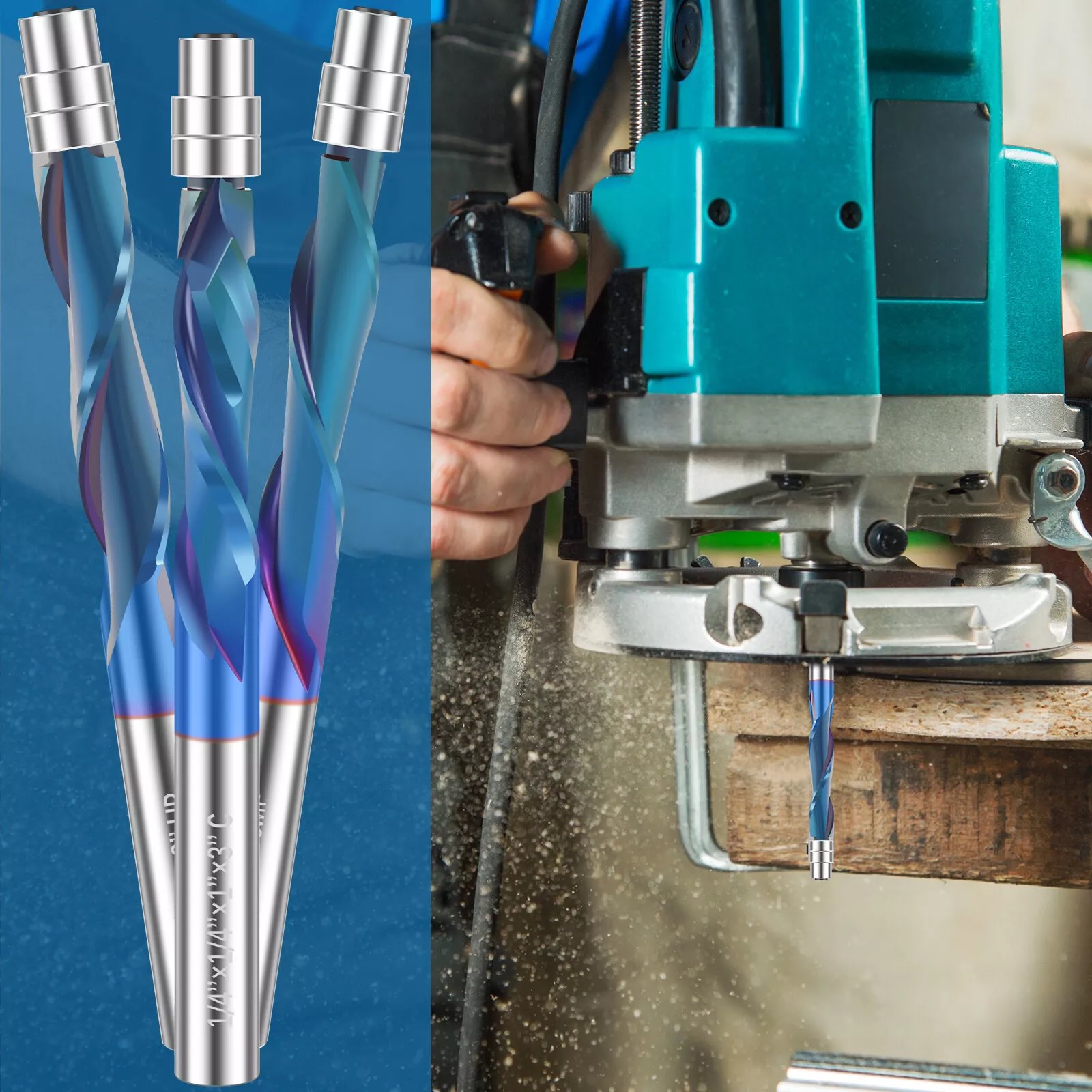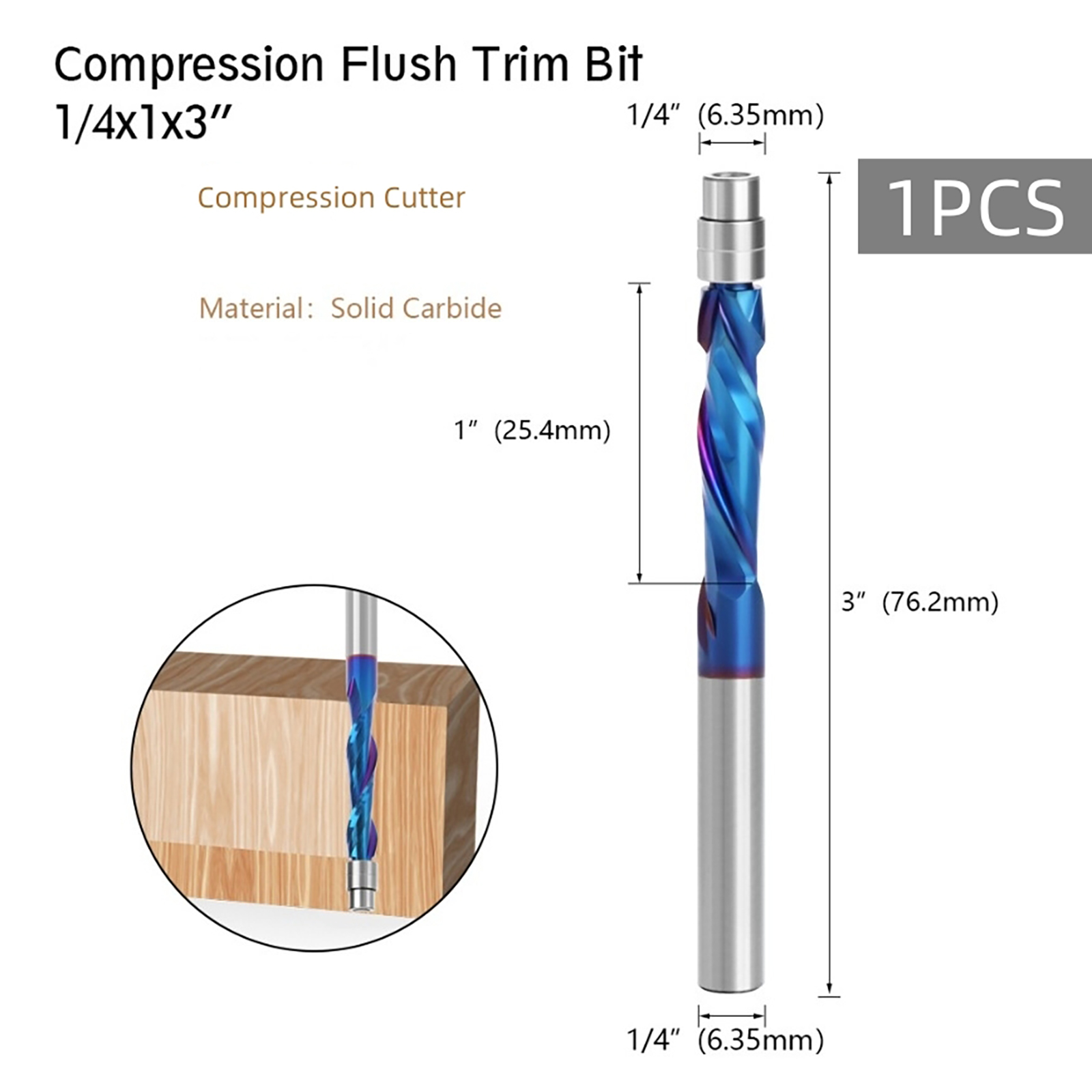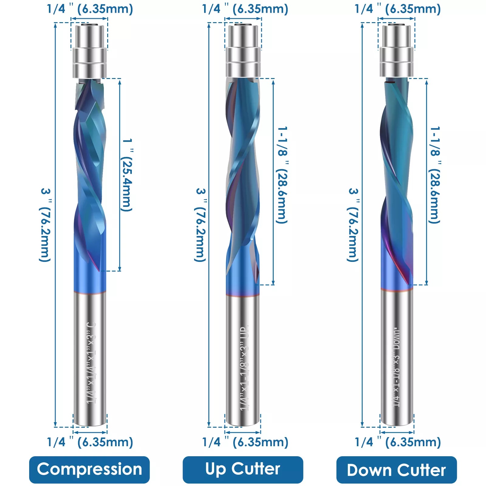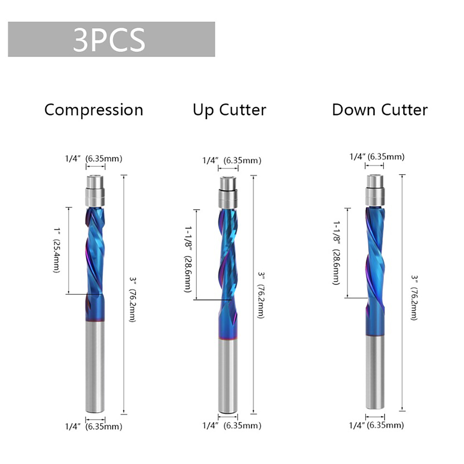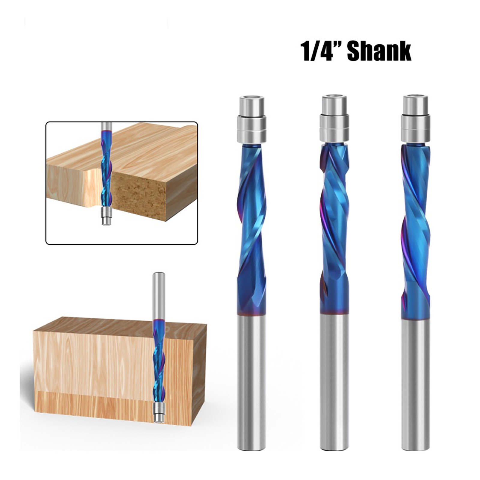 Our professional 1/4 inch spiral flush trim router bit features a top bearing and a 1/4 inch shank, accompanied by a 1 inch cutting length. Each bit's tip is equipped with two independent ball bearings and forced steel collars, ensuring smooth and effortless operation.