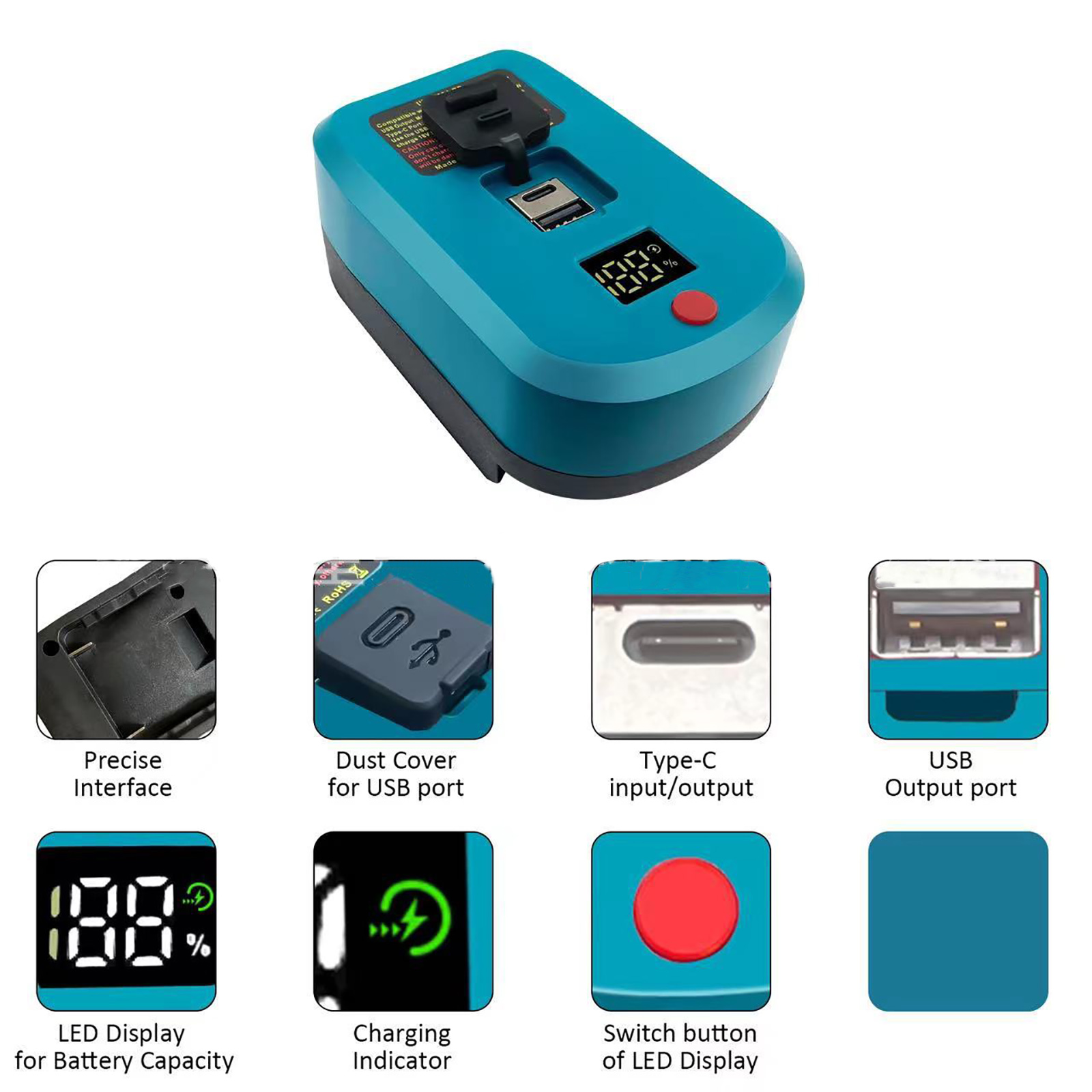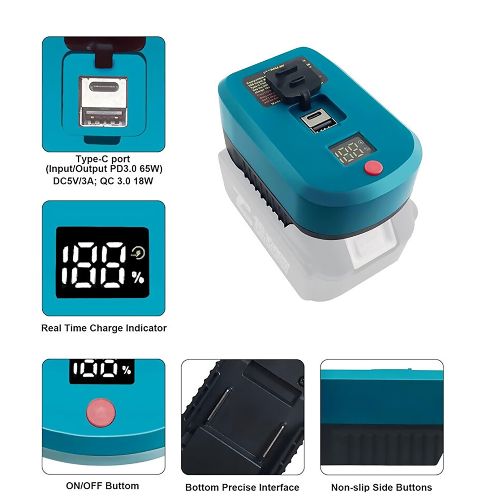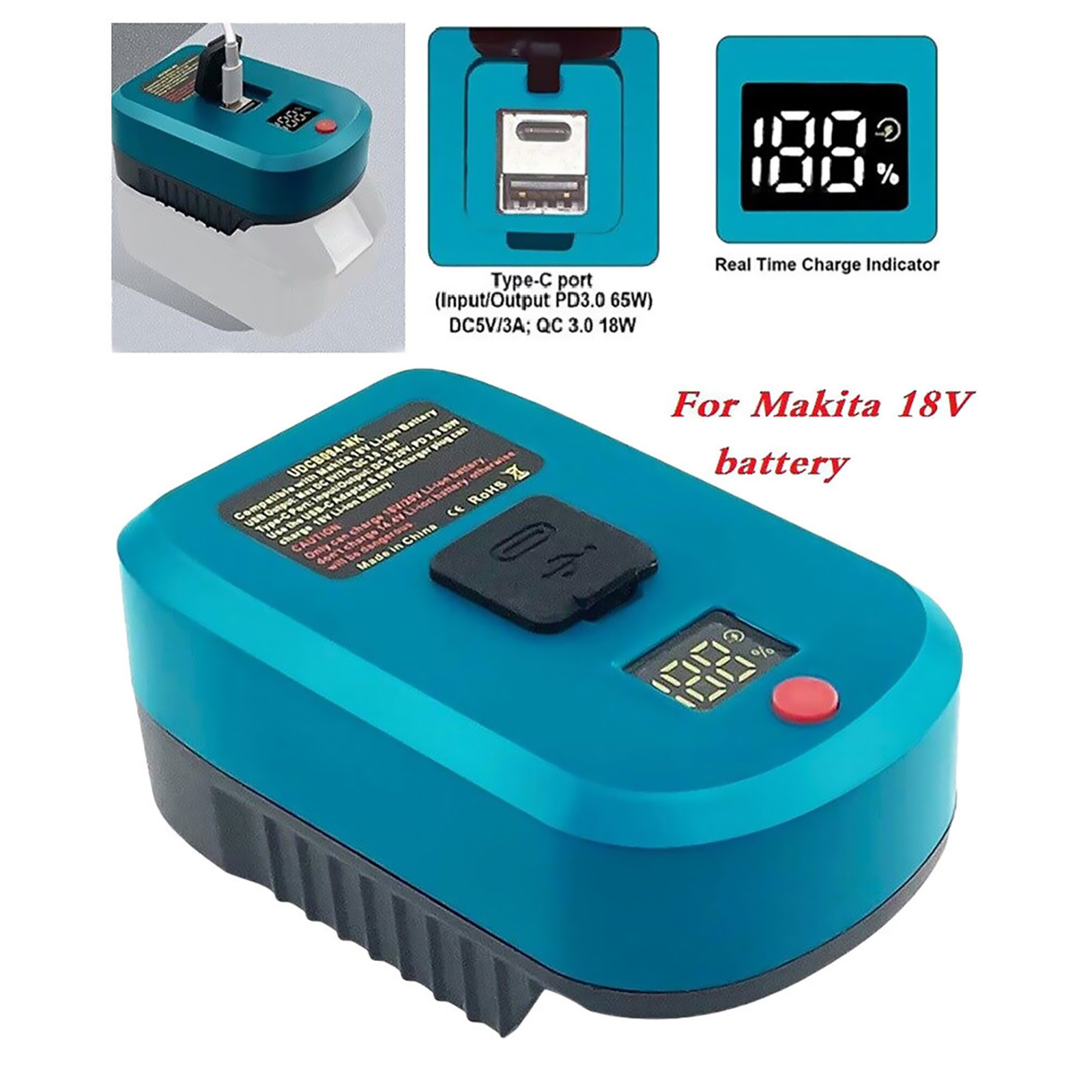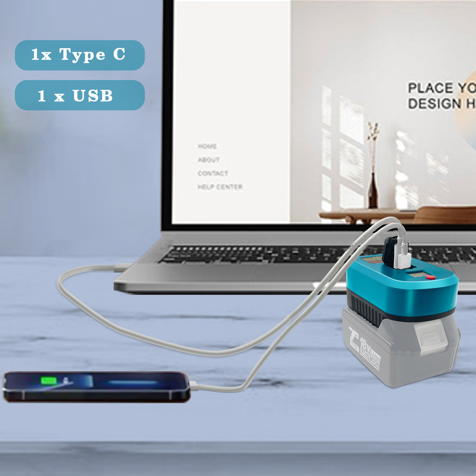 2 USB ports output: Output 1: USB Type-C 65W PD3.0; Output 2: USB-A QC3.0 18W. Use the 18V Li-ion battery (not included) on the construction site to charge small electronic devices as a power bank (for cameras, for iPads, for iPhone tablets, and other USB devices) when no main power is available.