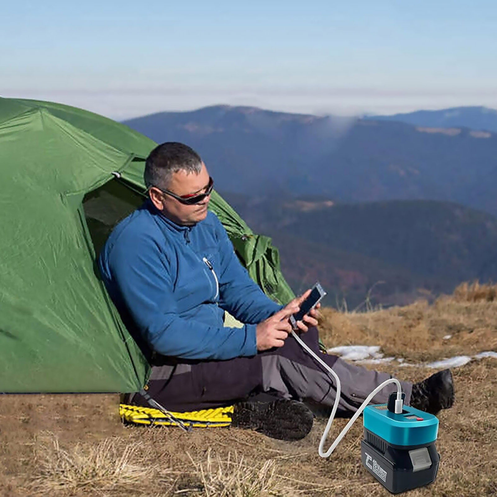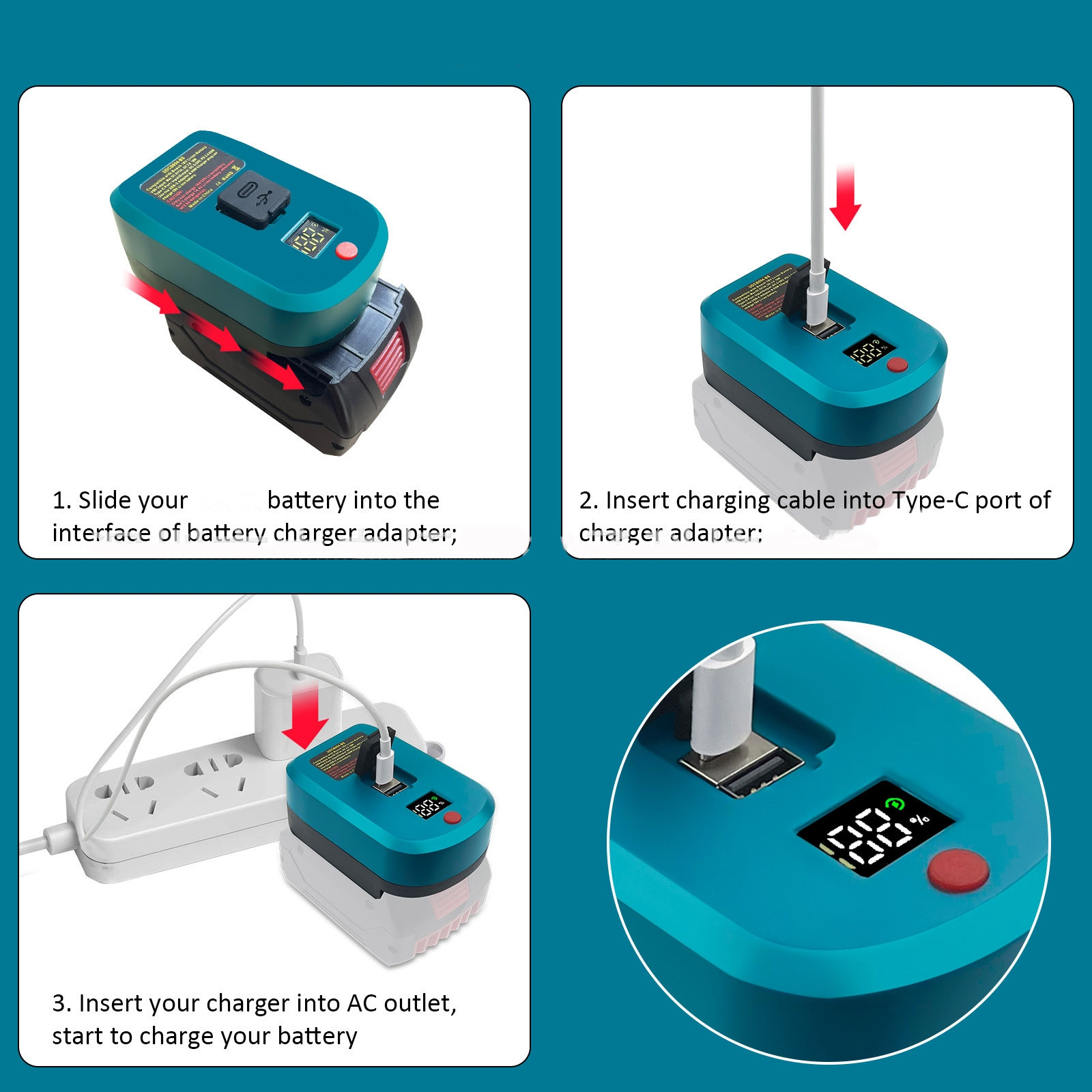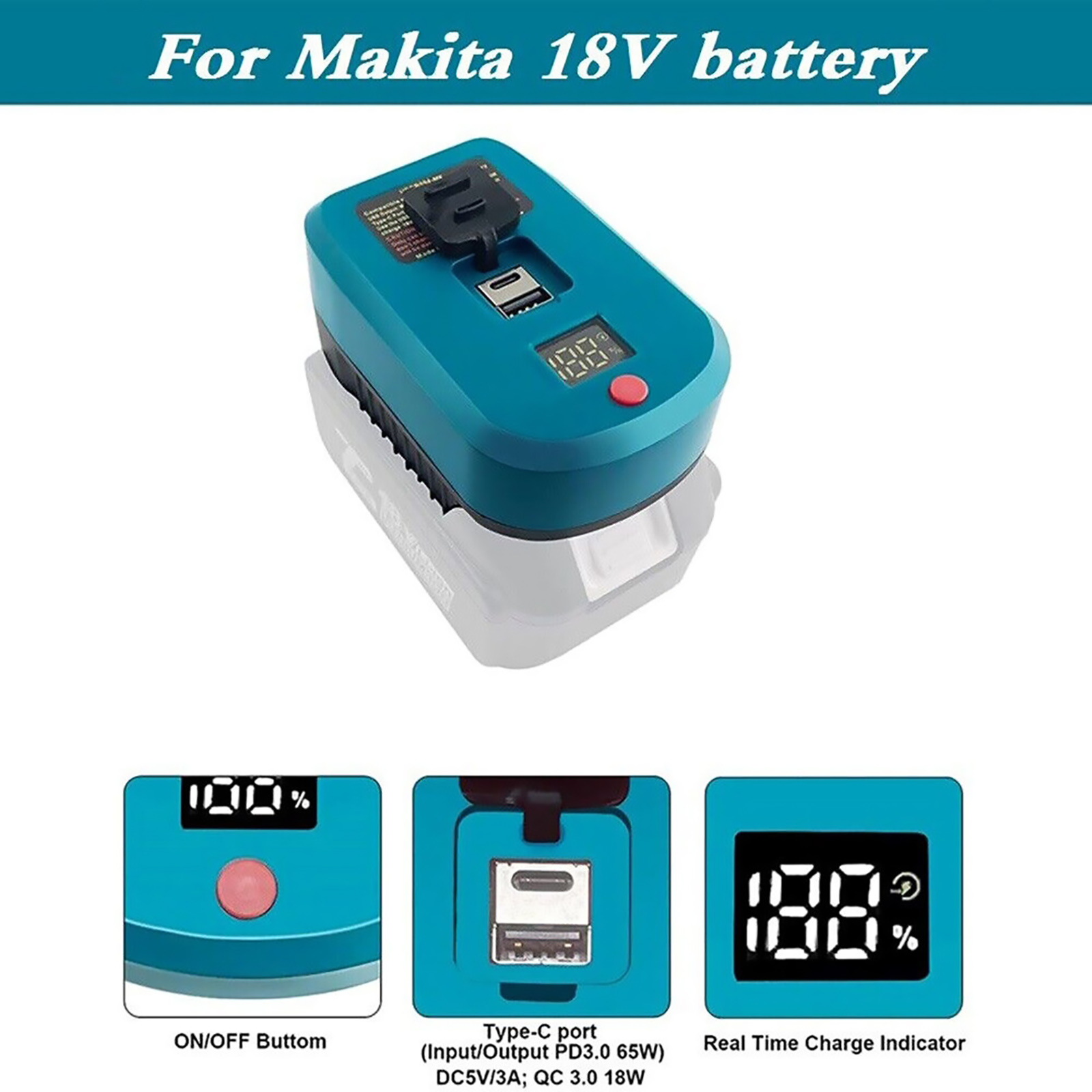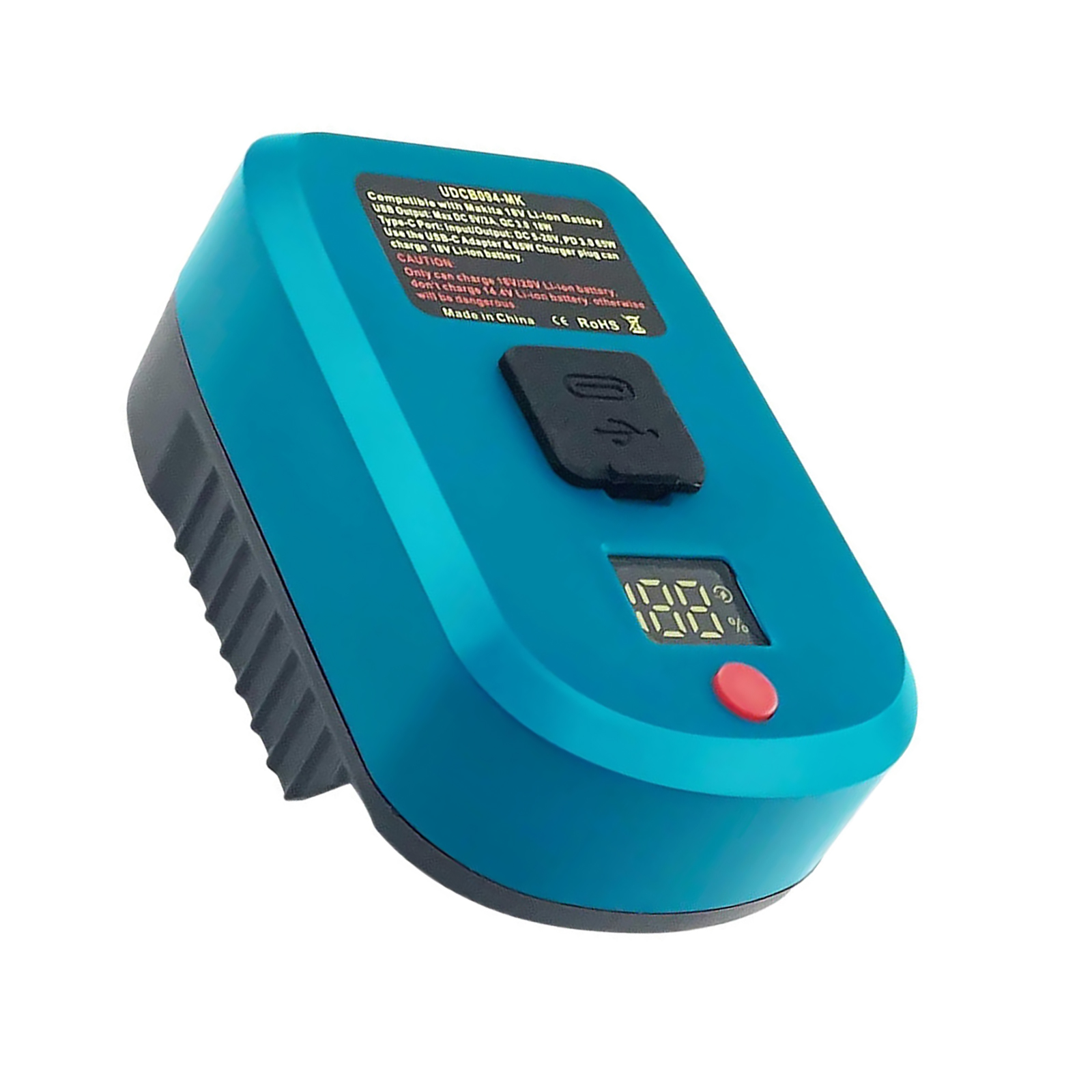 2 USB ports output: Output 1: USB Type-C 65W PD3.0; Output 2: USB-A QC3.0 18W. Use the 18V Li-ion battery (not included) on the construction site to charge small electronic devices as a power bank (for cameras, for iPads, for iPhone tablets, and other USB devices) when no main power is available.
