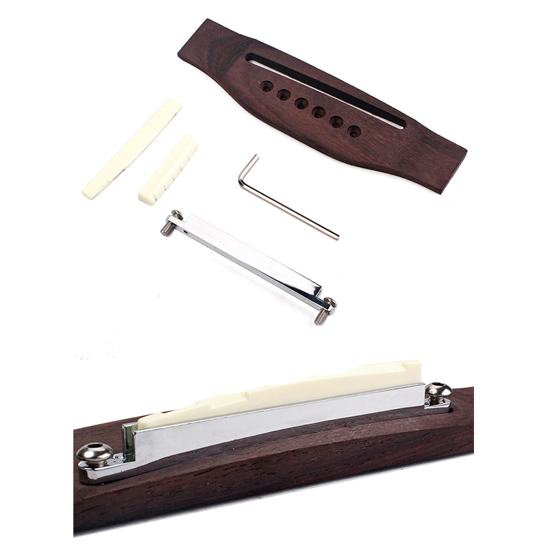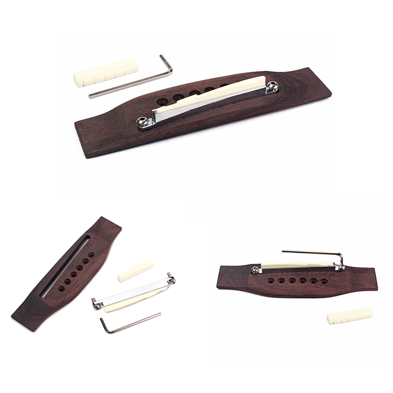 Bridge is made of rosewood, nut make of plastic and the shaft made of metal, very durable.