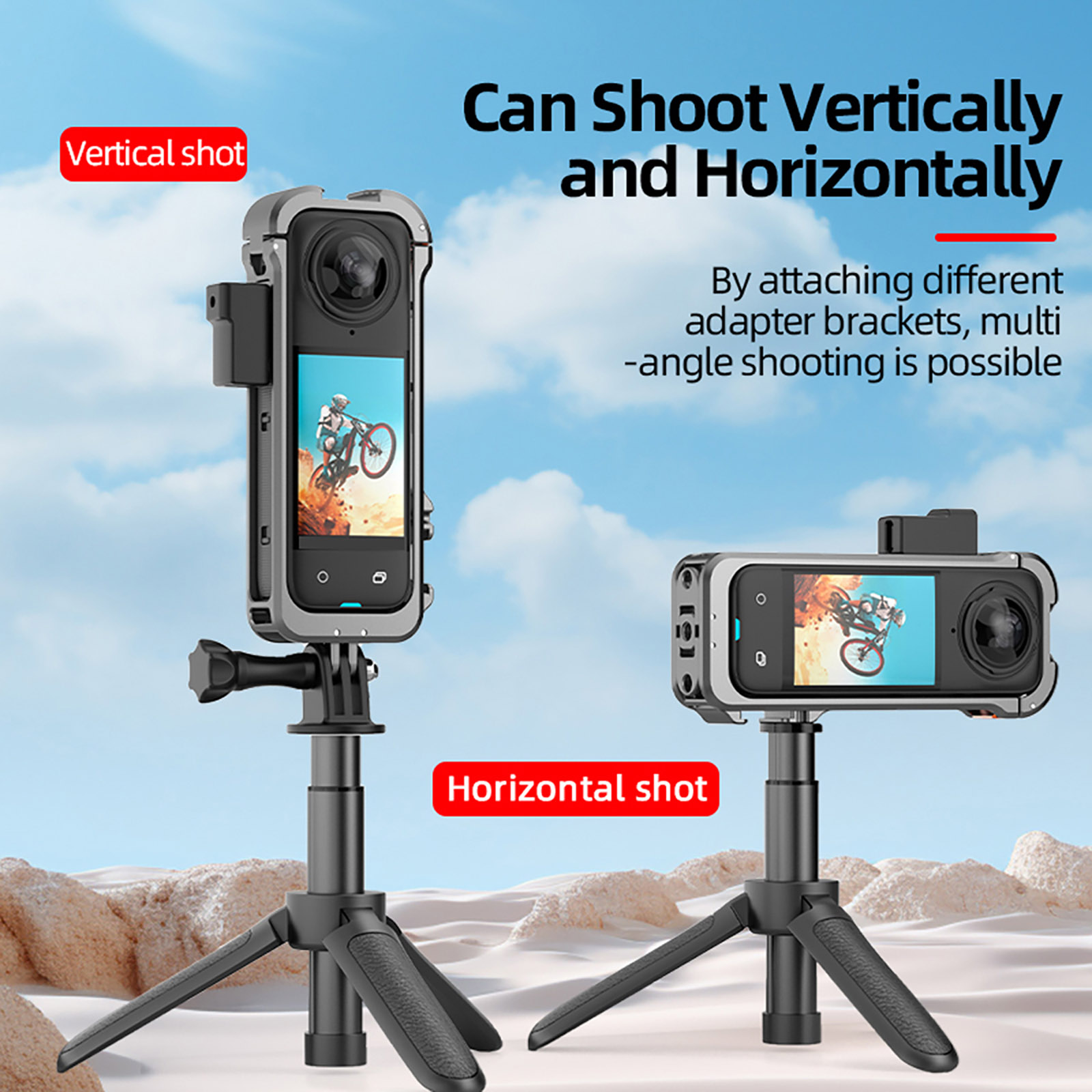 6. The horizontal shooting adapter can be fixed on the interface on the side of the protective frame for vertical shooting, and the quick-release adapter can be fixed on the bottom of the frame, and the horizontal and vertical shooting can be operated freely;