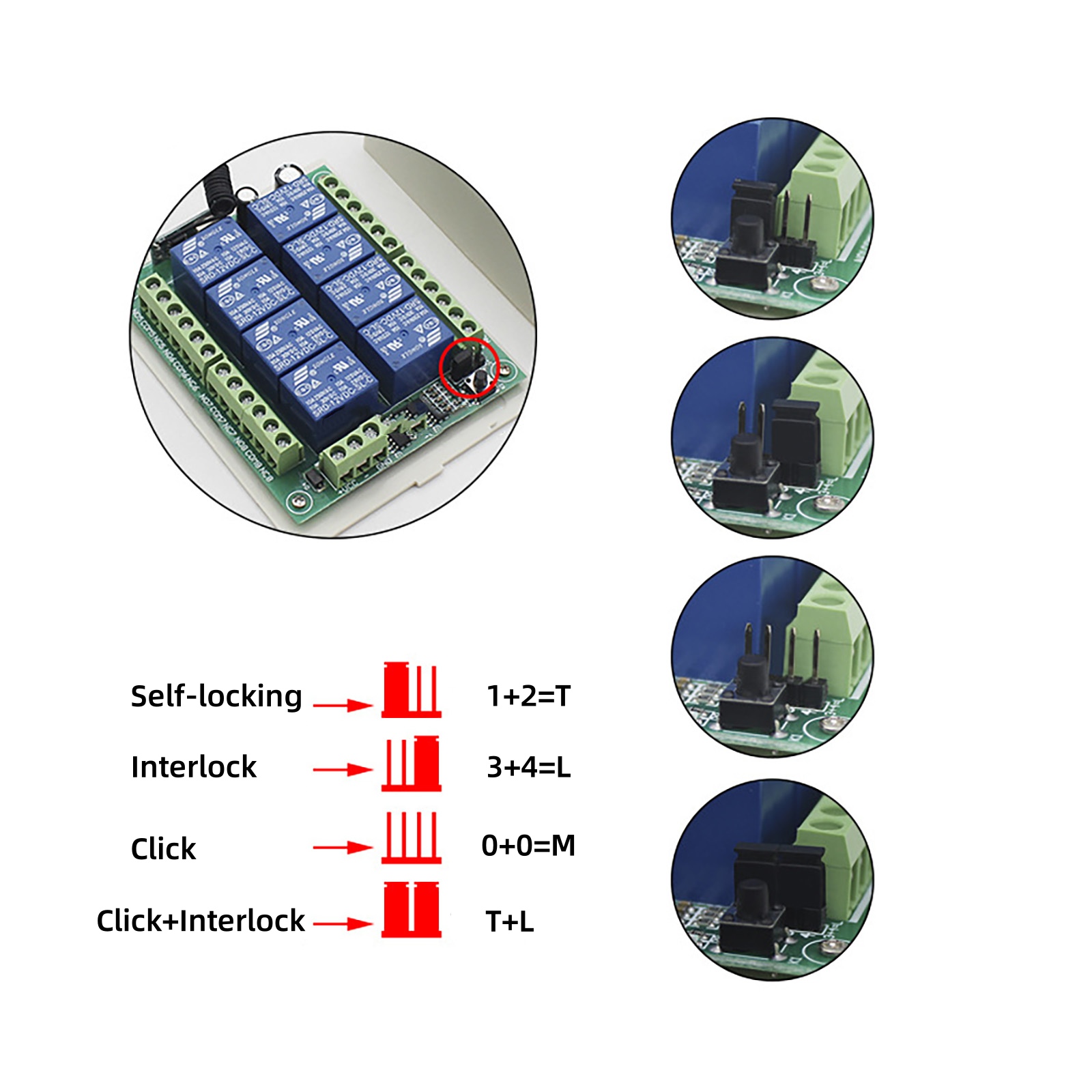 Self Locking+Interlocking Learning Method: Insert 2 Jumper Caps, 1/2/3/4 Self-Locking, 5/6/7/8 Interlocking.