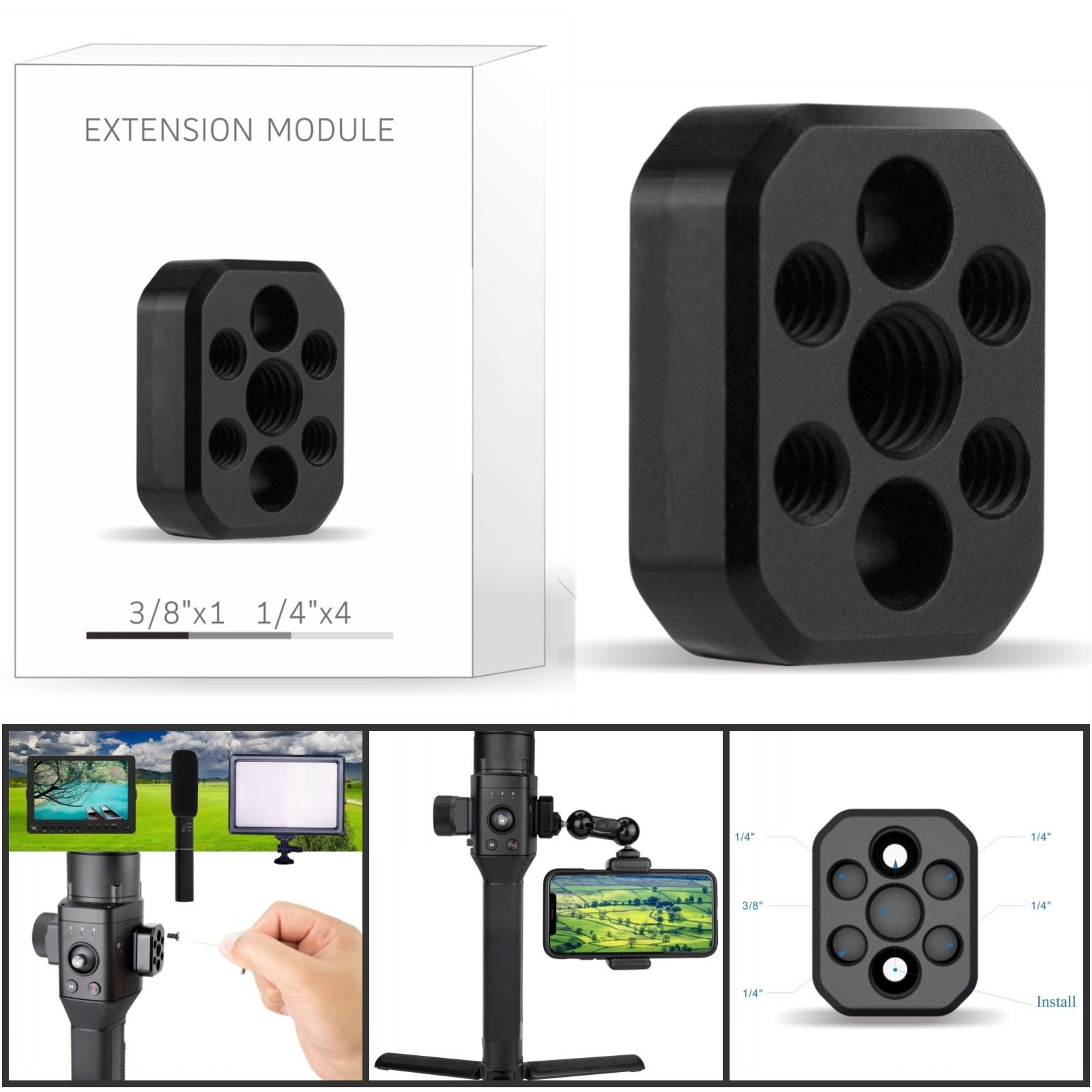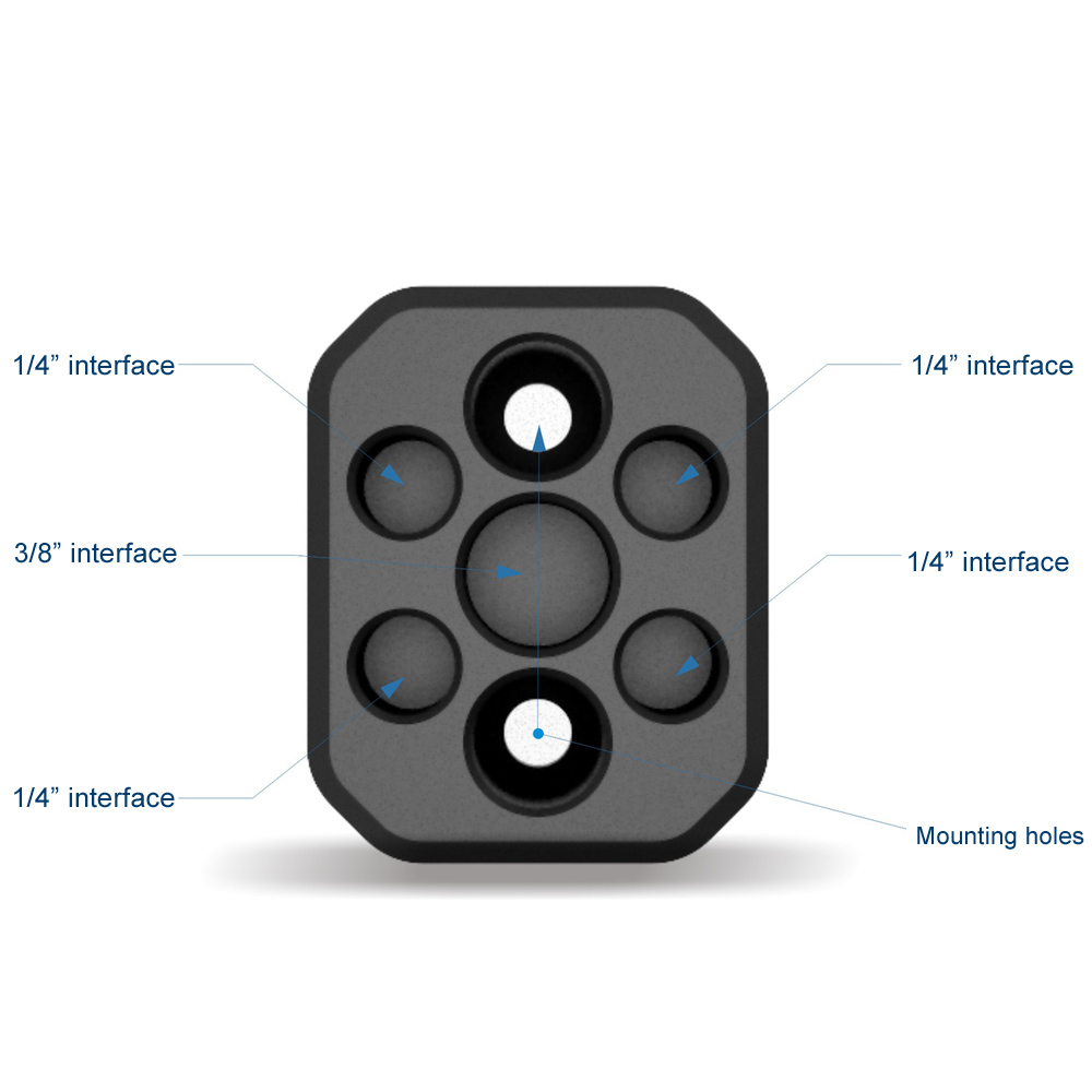 Designed with four 1/4” and one 3/8” screw hole, can extend multi accessories, such as magic arm, monitor and etc