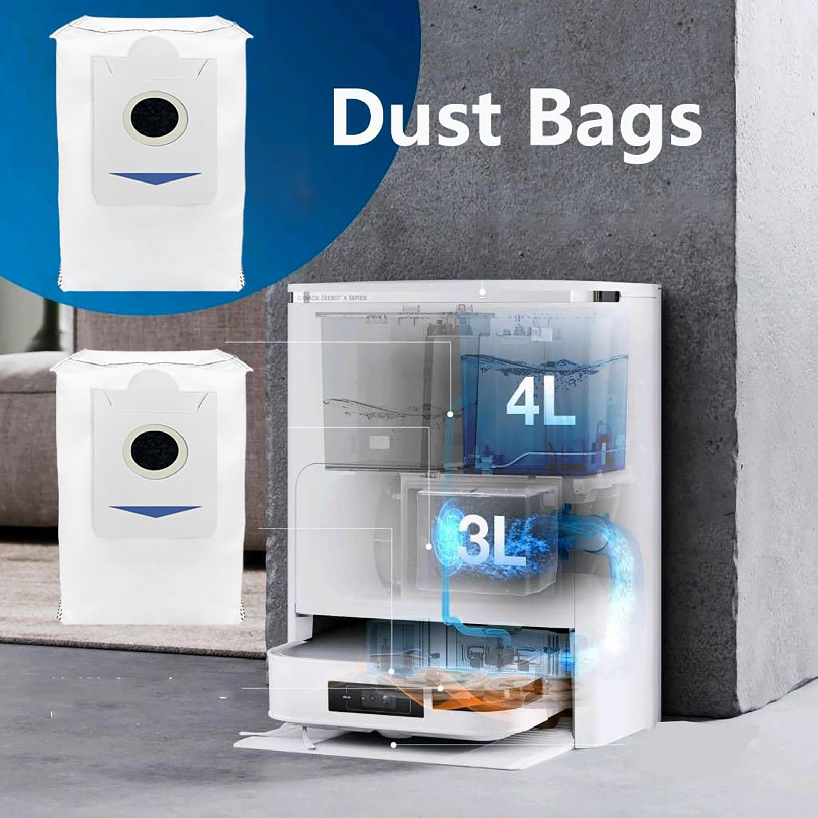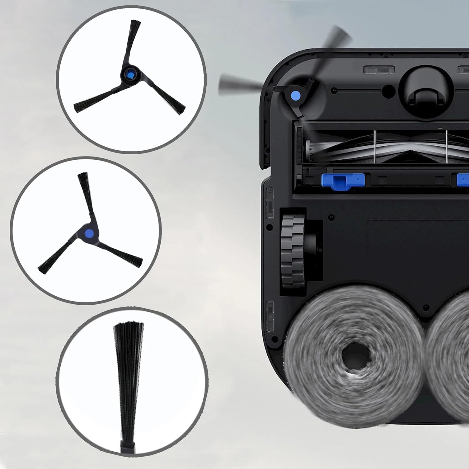 Main Brush and Side Brushes are easy to remove dirt, dust and trash in corners and edges effectively. Especially your hairs and your pets hairs. The dust bag is made of melt-blown fabric and non-woven fabric, combined with the cleaning station can effectively capture 99.7% of ultra-fine dust down to 0.3 tiny particles.