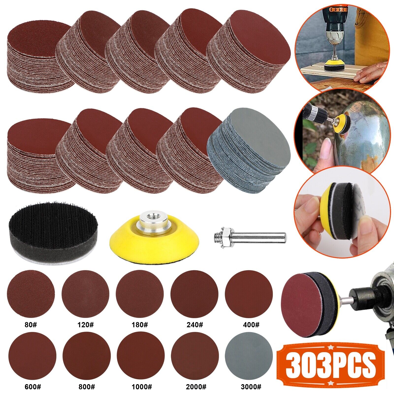 Multiple Sizes and Quantity: Come with 300pcs sanding discs pad with 1pcs Polishing Plate, 1pcs Soft Foam Buffering Pad, 1pcs Thread Shank; 30pcs of each 80#, 120#,180#, 240#, 400#, 600#, 800#, 1000#,2000#, 3000#, total 303pcs.