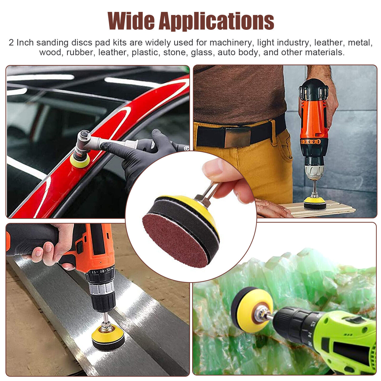 Wide Applications: 2 Inch sanding discs pad kits are widely used for machinery, light industry, leather, metal, wood, rubber, leather, plastic, stone, glass, auto body, and other materials. These round sanding pad assortments are suitable for most kinds of rotary tools, such as die grinders, air grinders, and electric drills for 1/4 inch connecting rods.