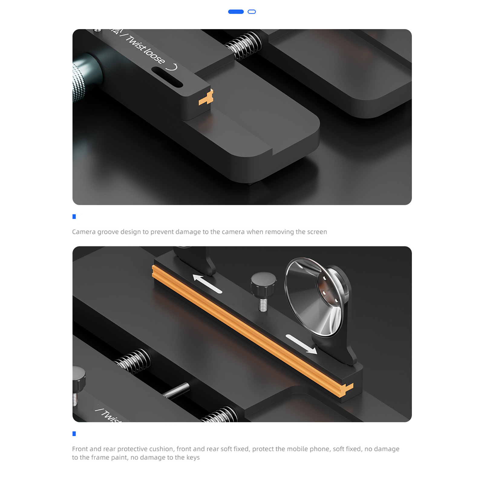 Safe pressure protection/efficient removal of rear cover glass/side hanging screen easy maintenance/screen fixation.