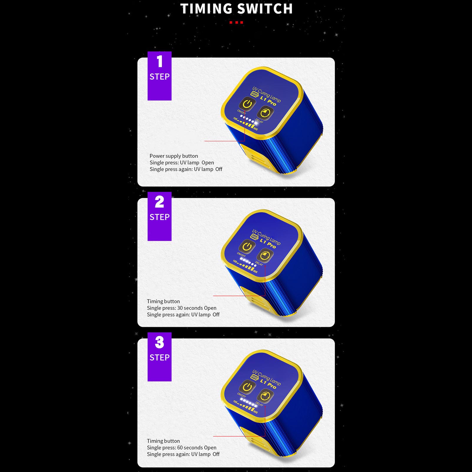 Aim the curing light at the glued area for 3-5 secondsto produce the curing effect