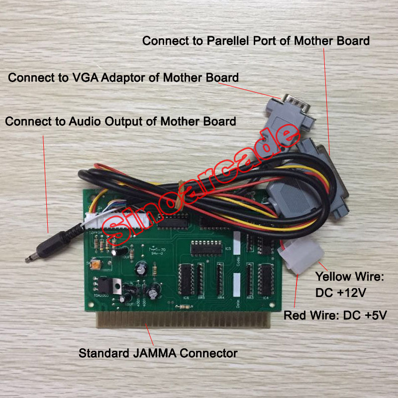 PC to JAMMA board is designed for converting the signals of keyboard to arcade joystick and support standard CGA (RGB) monitor: It only works with DOS version MAME games, you have to install all required software and drivers for your PC by yourself. We don’t provide any drivers and softwares.