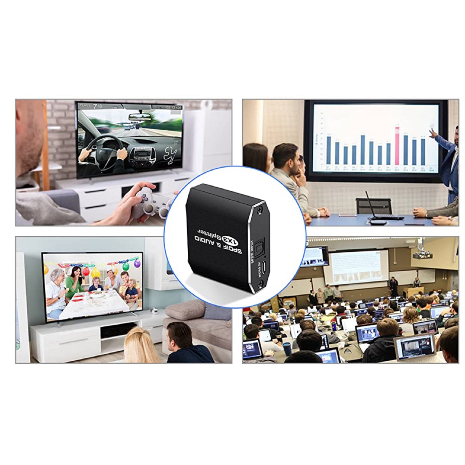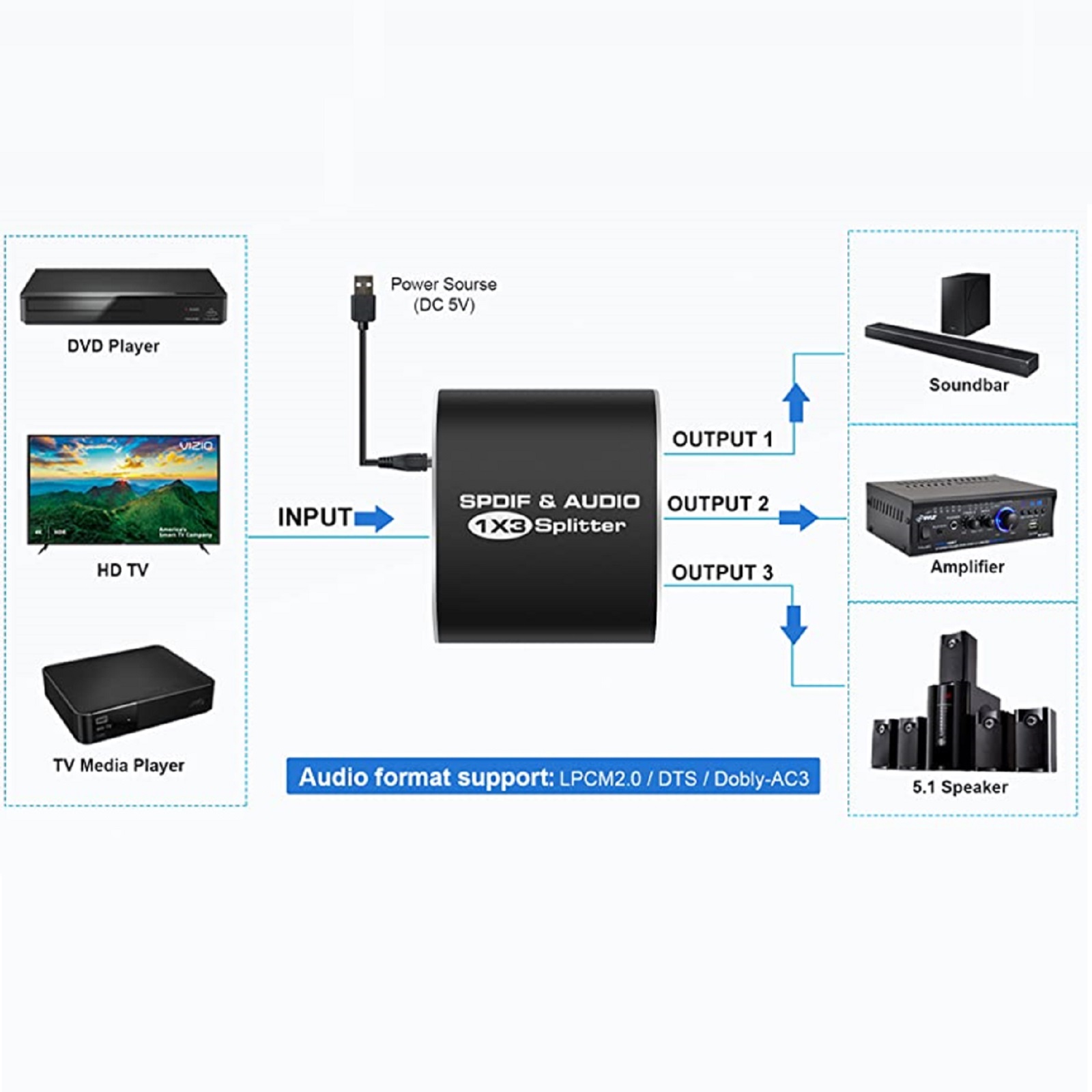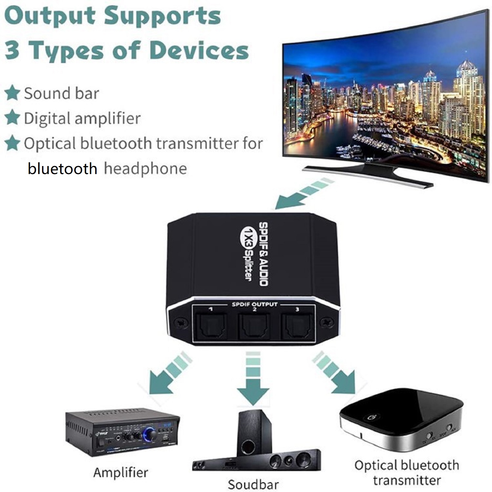 4. This Toslink splitter splits a single SPDIF (Toslink) Digital Optical Audio signal into three outputs. It allows you to connect a single optical audio source,