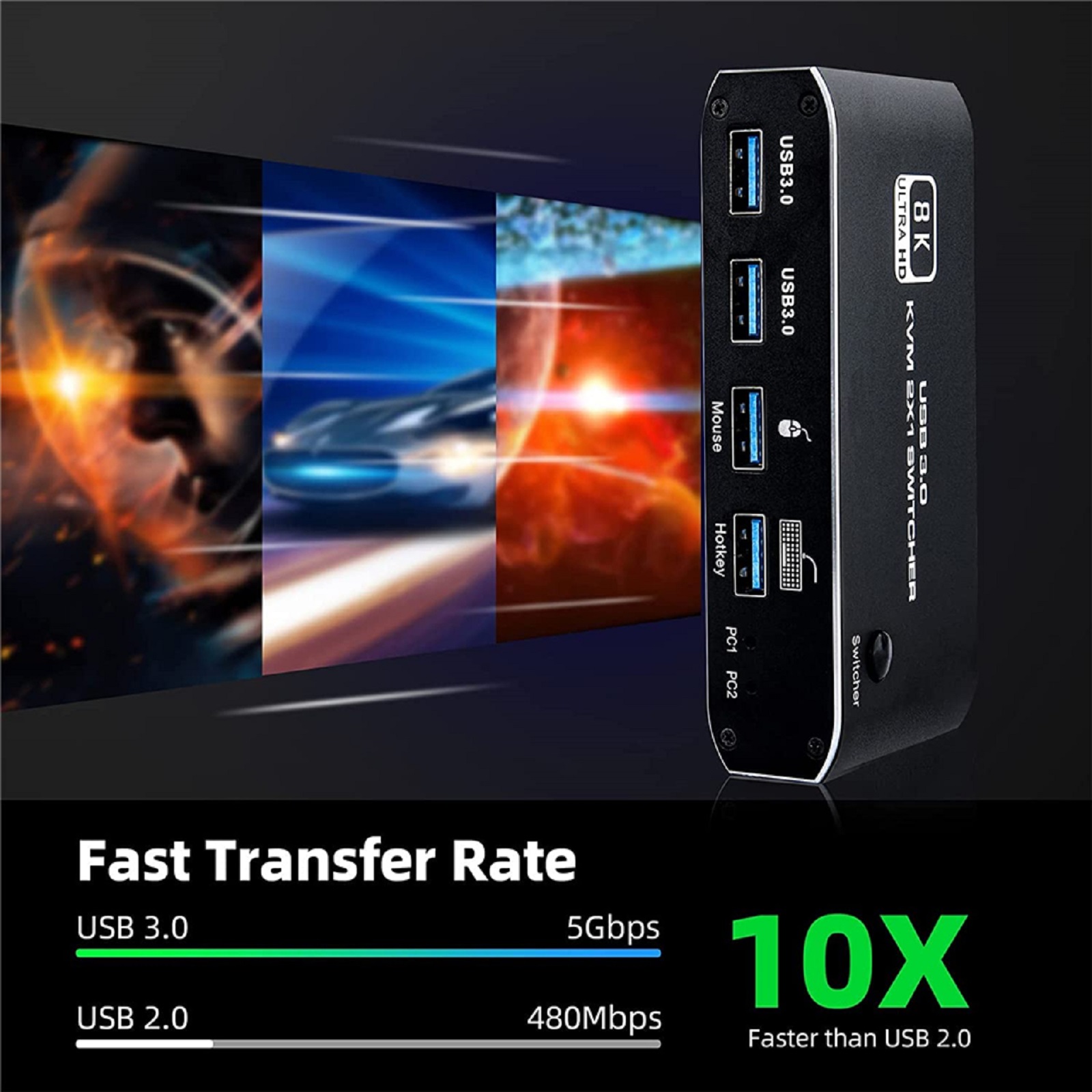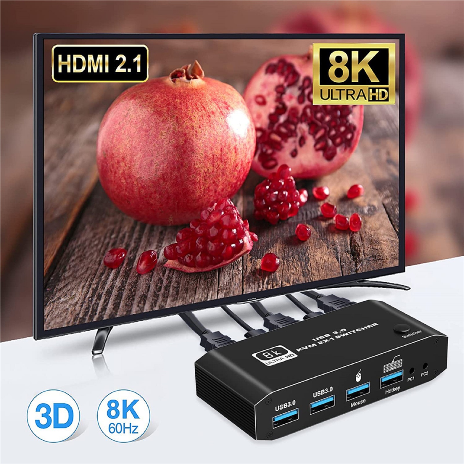 HDMI 2.1 KVM Switch 2X1 4K 120Hz 8K 4 Port USB 3.0 KVM Switcher with Hotkey