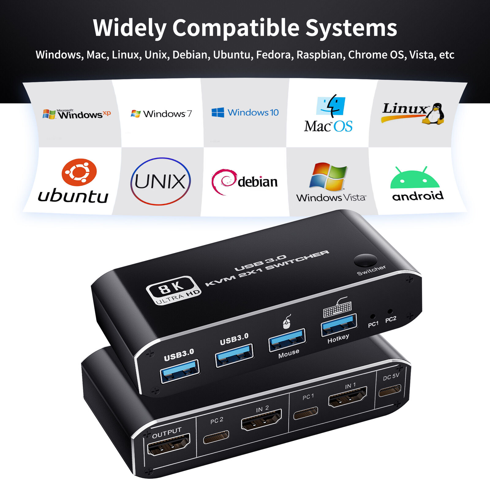 2. High Resolutions: Ensuring high-quality video capability, the HDMI KVM switch supports HD resolutions of up to 8K@60Hz and 4K@120Hz.