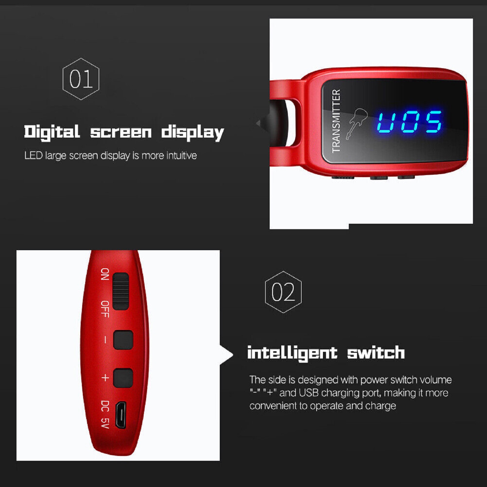 The LED display shows the current frequency band, volume and current battery level.