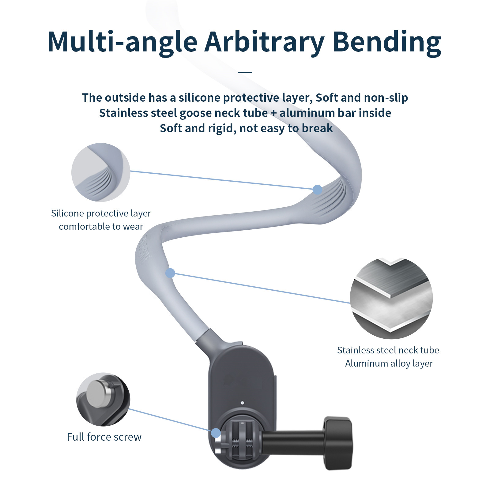 3.Multi-angle arbitrary bending, soft and rigid,not easy to break. Has silicone protective layer, soft and non-slip stainless steel goose neck tube+aluminum bar inside.