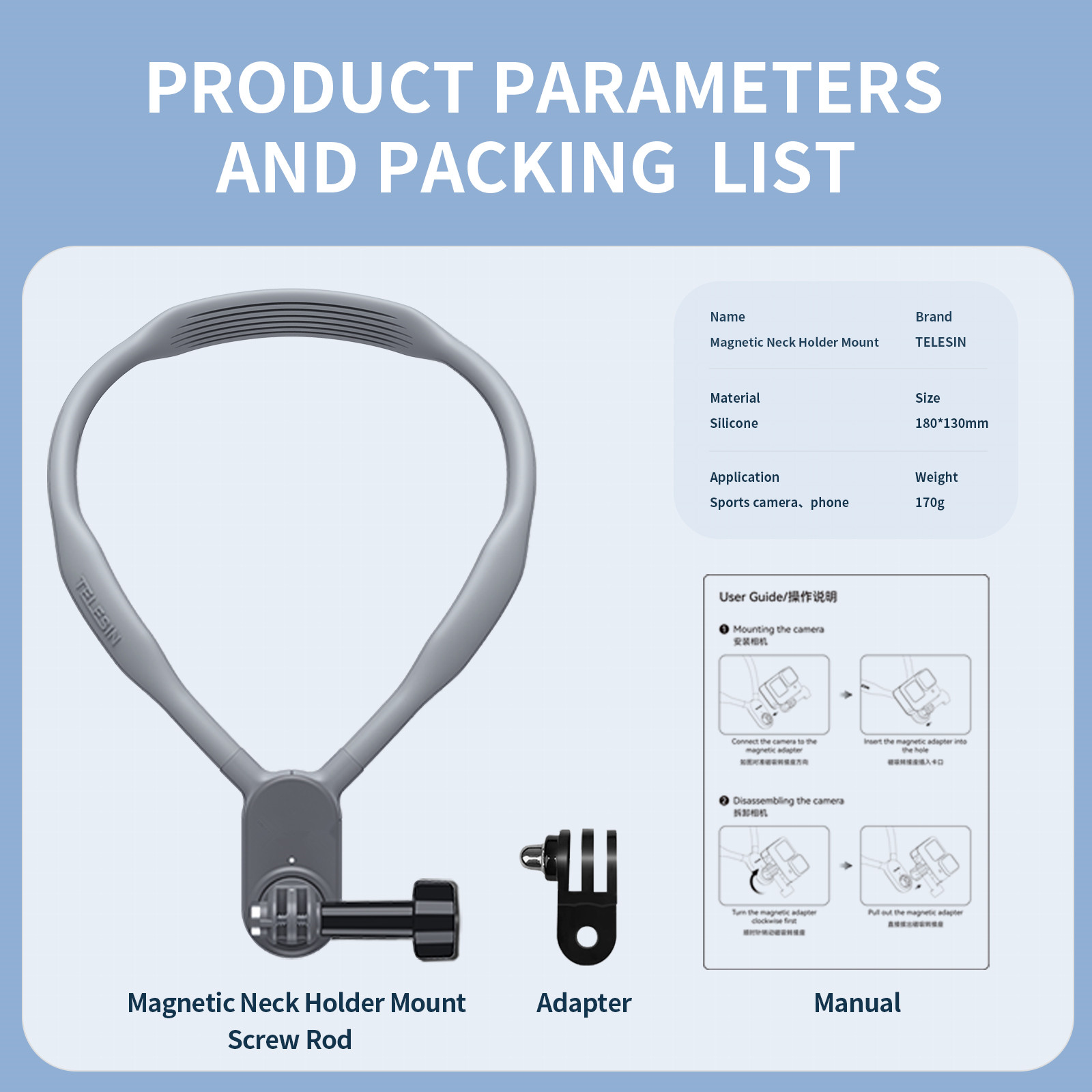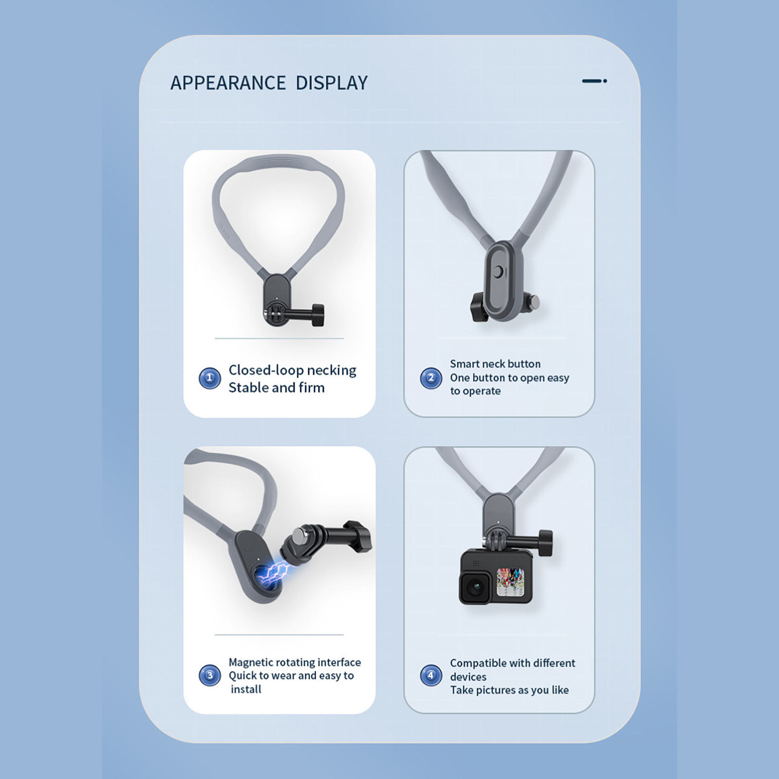 2.Free your hands. Quick release button helps you remove the neck hold mount. Magnetic rotating interface quick to wear and easy to install.