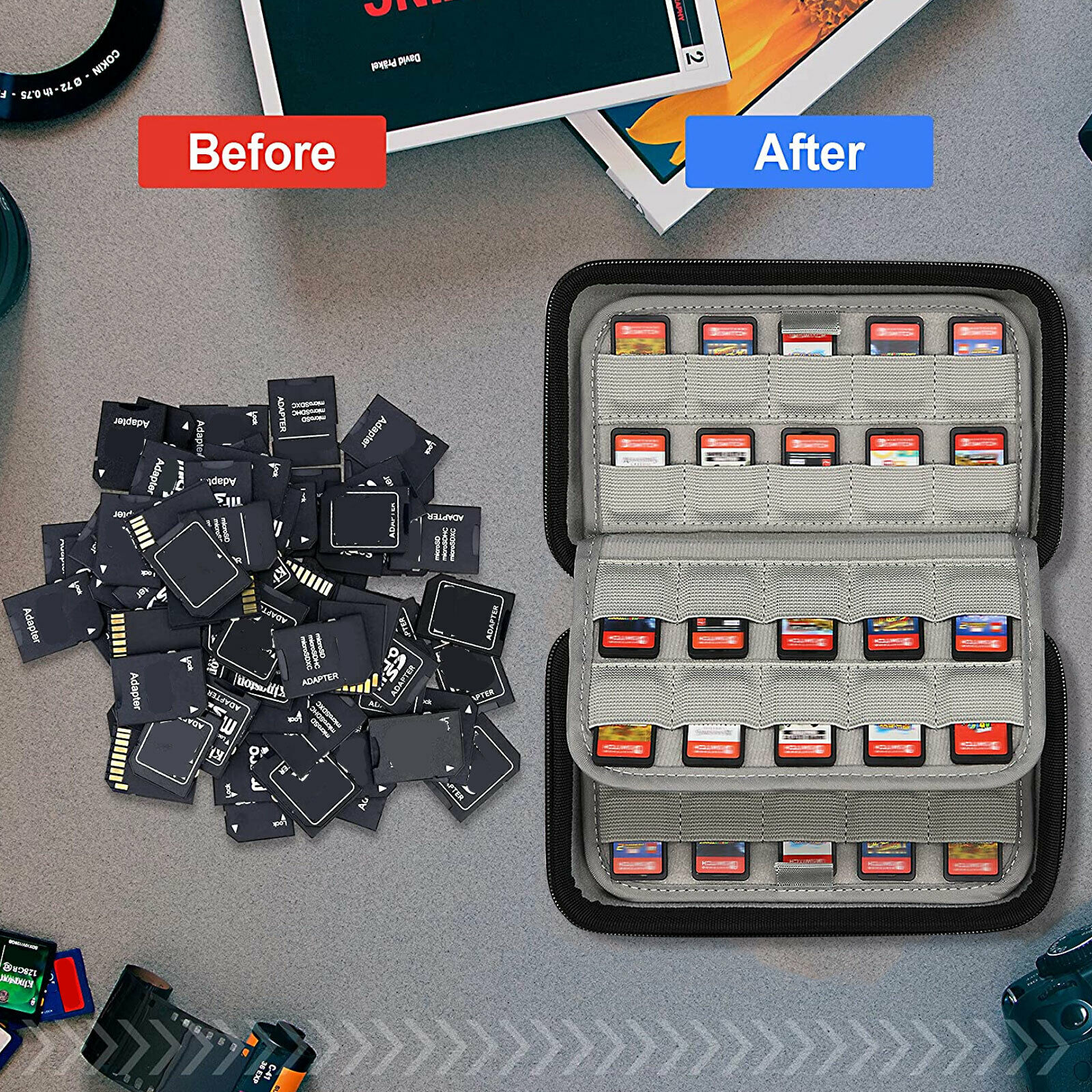 The games and memory cards storage case nicely hold up to 80 cards. It is compact and durable that gives you a perfect storage solution. Don't worry about your game cards in a mess. What's more, you can carry it while on the go, enhance your gaming experience.
