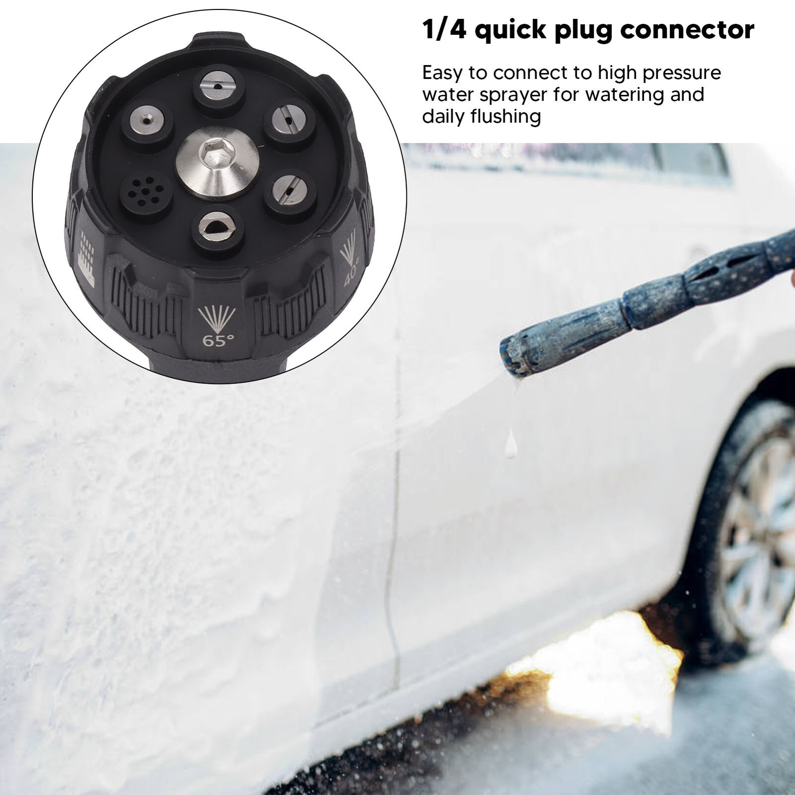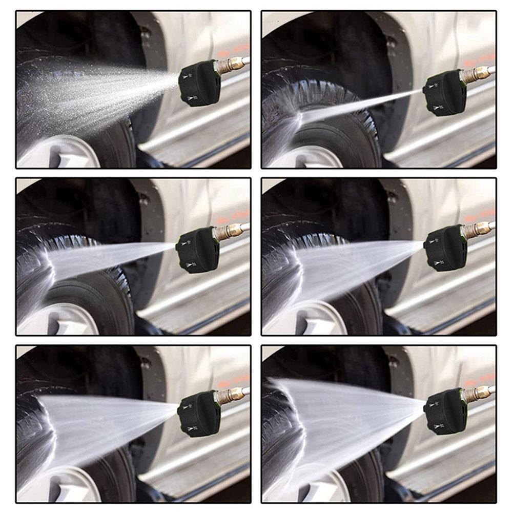 1. This 6 in 1 nozzle offers 6 different quick changing modes including standard nozzles at shower, 0, 15, 25, 40, 65 degrees, nozzles and rinsing, rinsing is ideal for garden watering and removing unstable dirt in hard to areas.