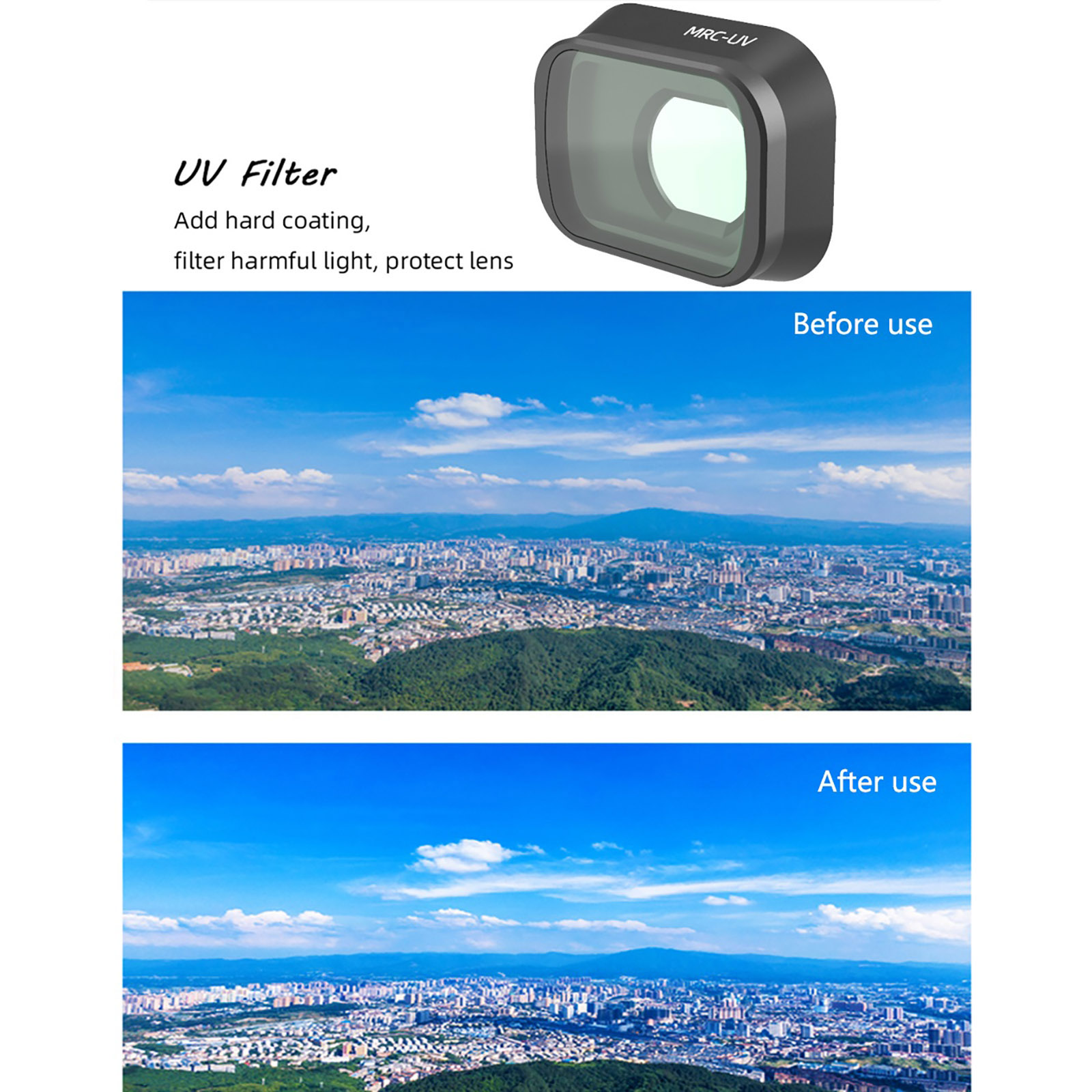 Reduce haze and improve contrast to your video and digital images by minimizing the amount of ultraviolet (UV) light. Especially useful in areas of high altitude, snow, or beach, eliminating the undesirable blue cast. Imported optical glass, top level of transmittance.