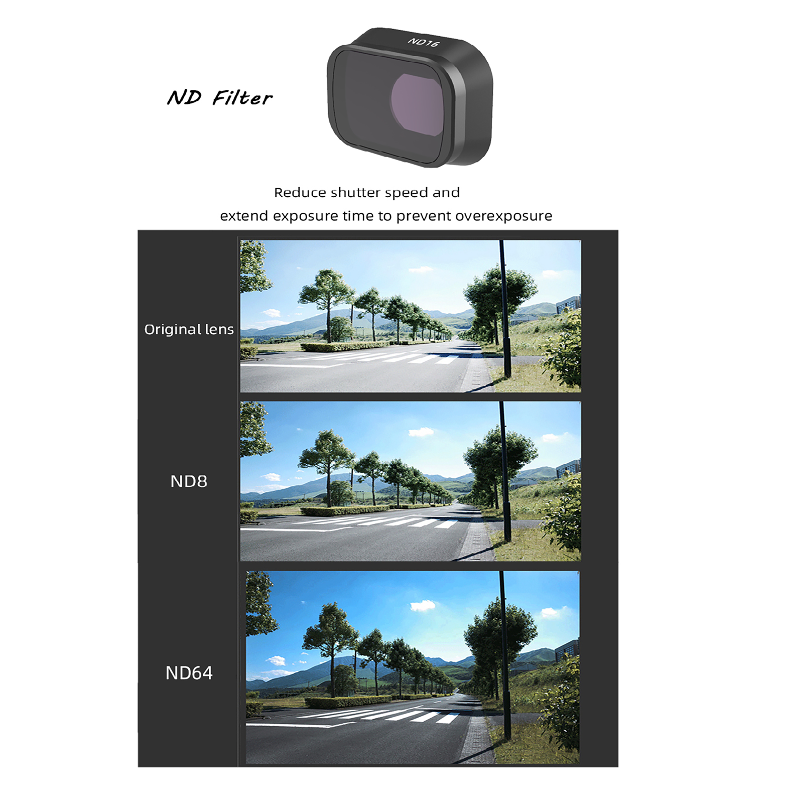 The main function is to reduce the amount of incoming light when the light is too bright, so that the camera can select the correct exposure value and avoid overexposure.