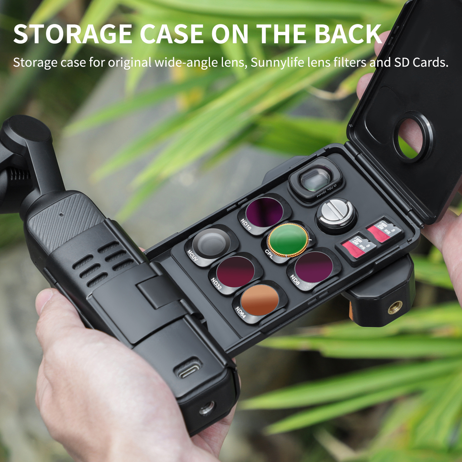 Attentive storage box design. Exquisite storage box design on the back, can store the original widening lens, Sunnylife filters and memory cards.