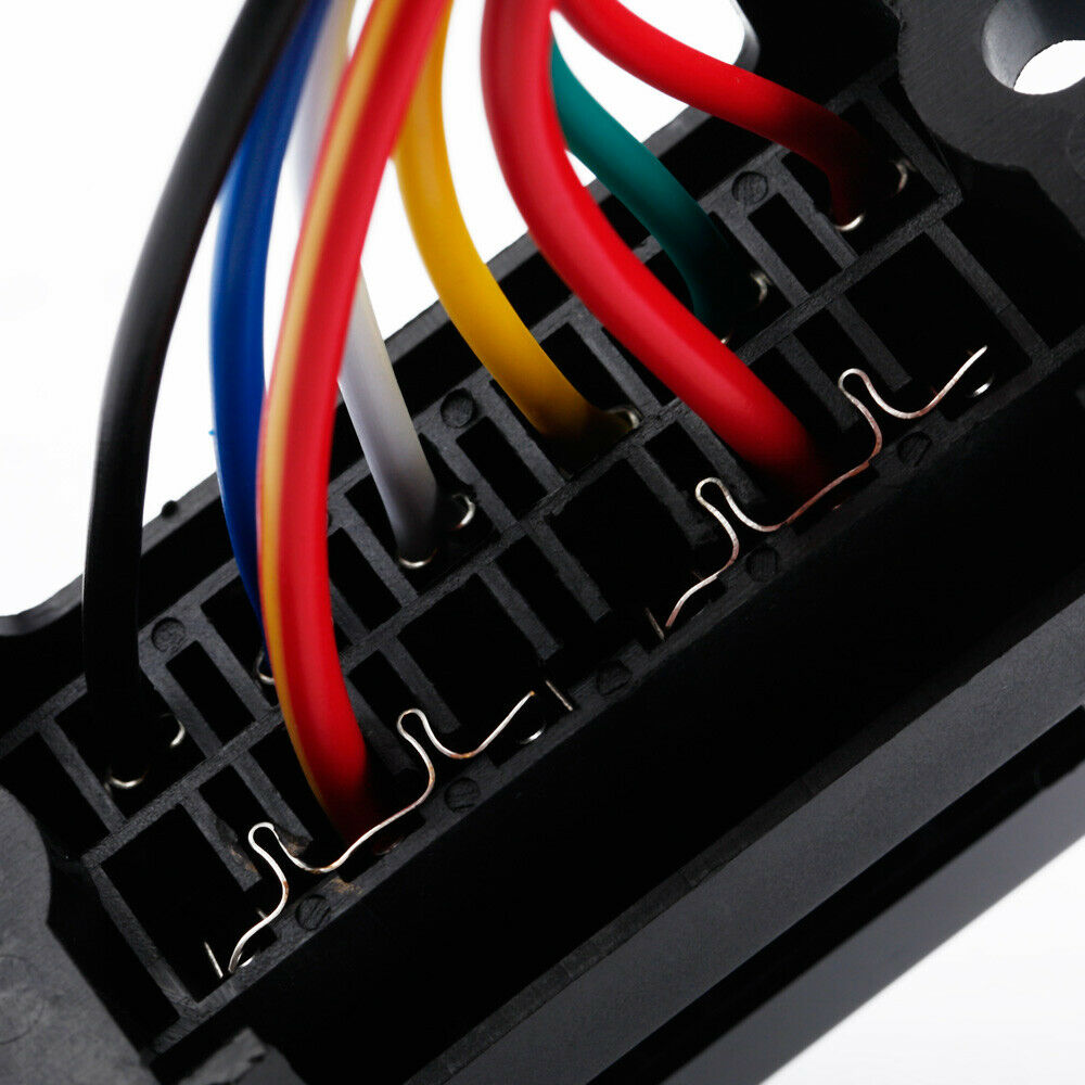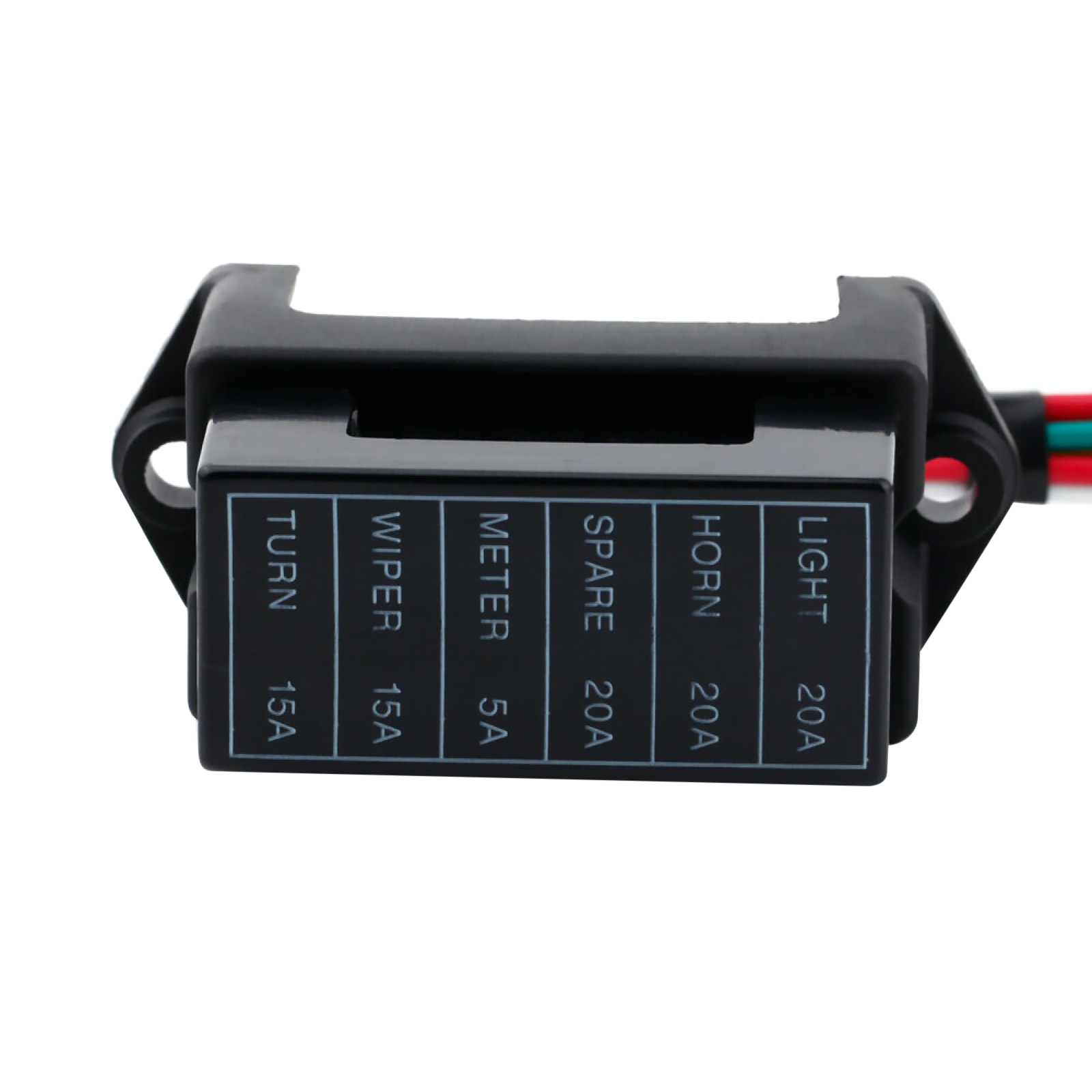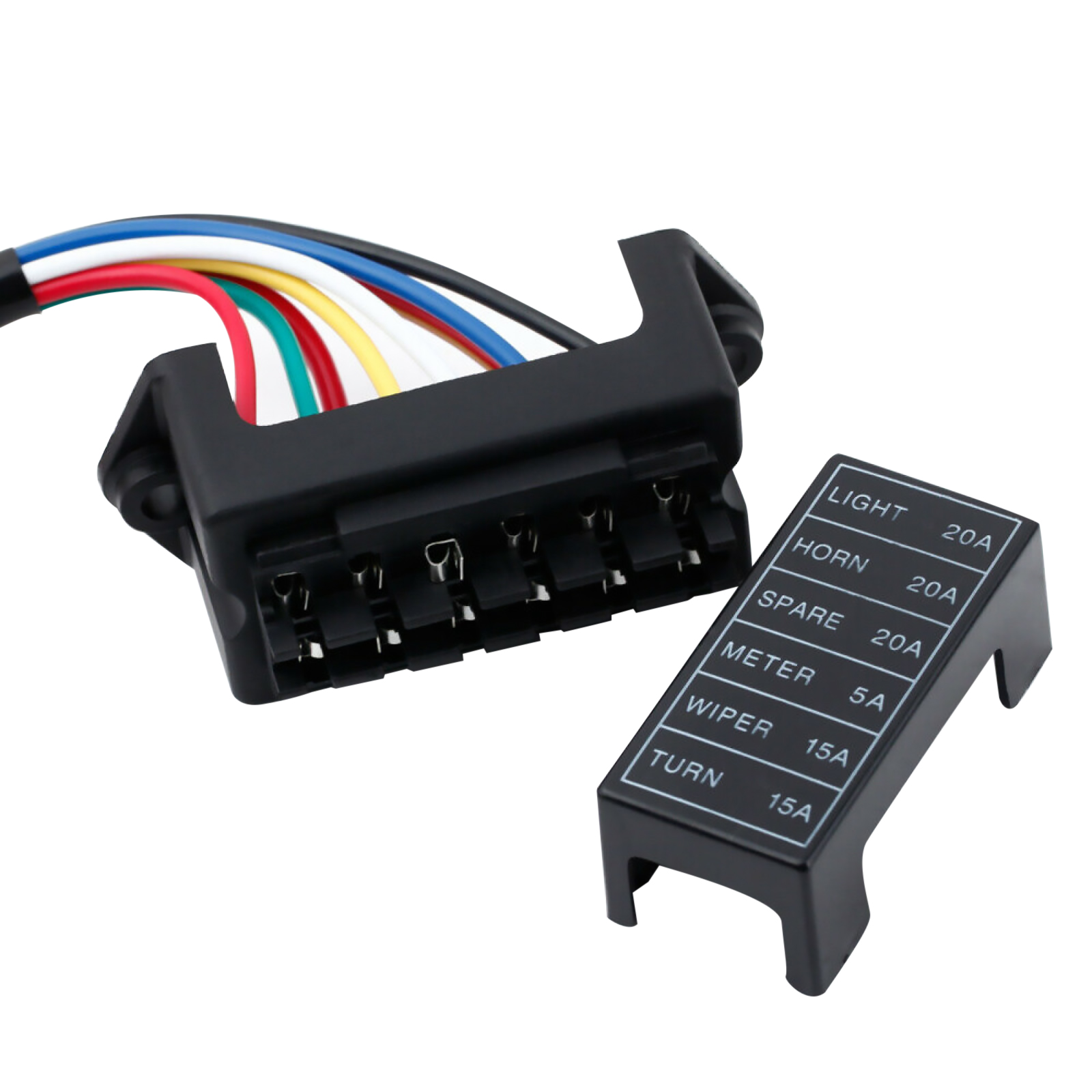 6-way fuse box with 8 wires (2 input wires + 6 output wires).