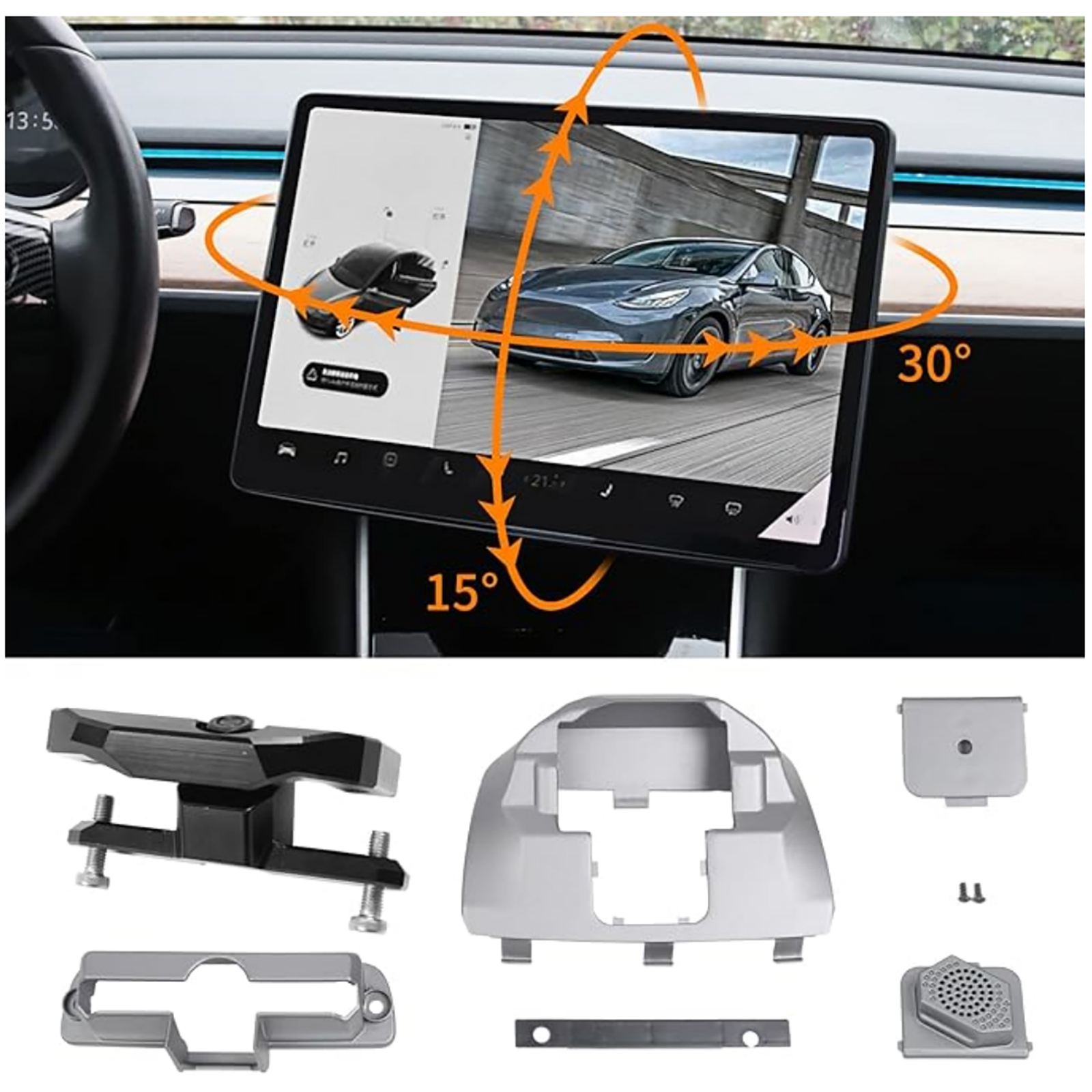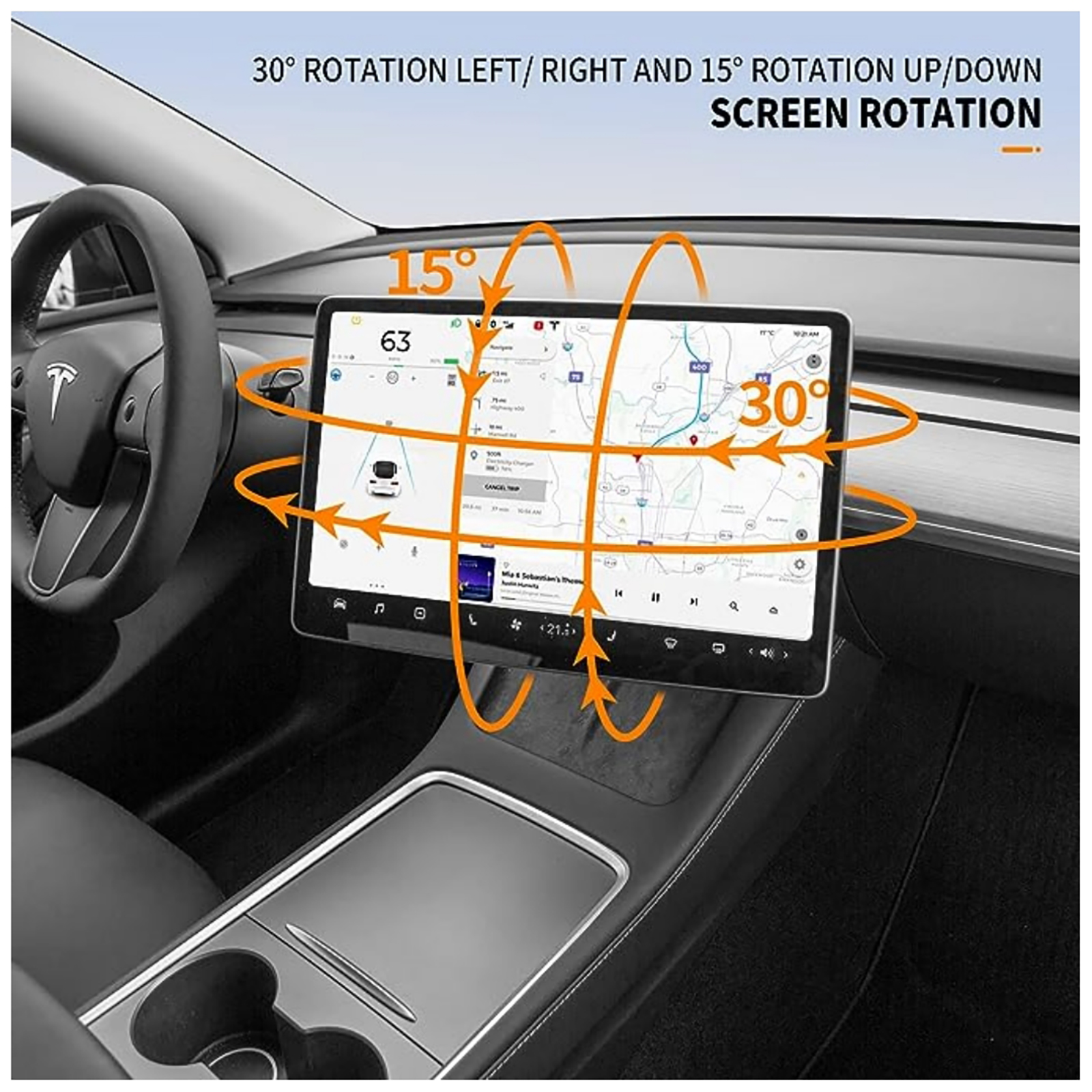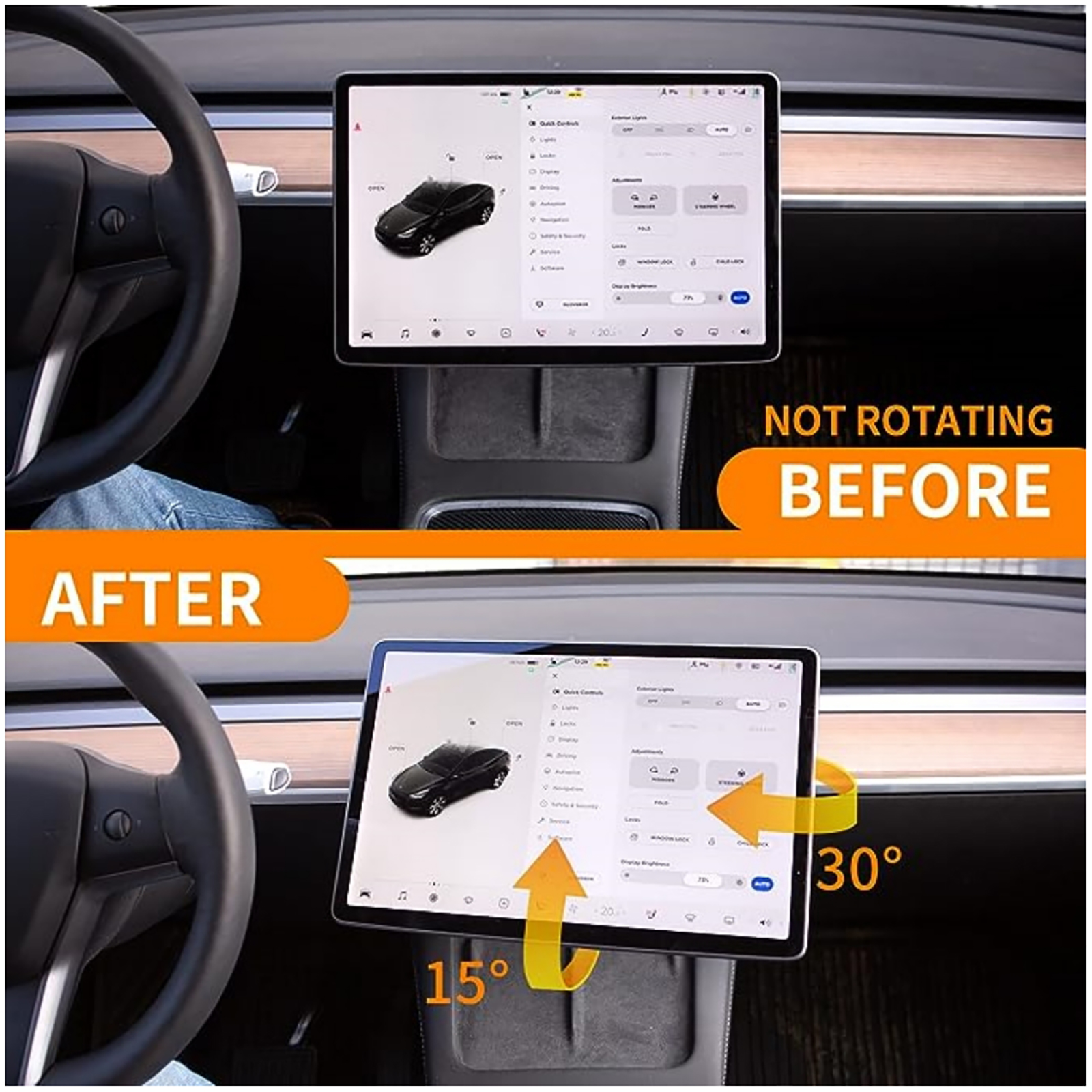 The screen swivel mount can be rotated towards four directions: up and down, left and right. 15 degrees are available for up and down; 30 degrees are available for left and right. You can flexibly adjust your screen at the angle you want. Driver can have a easier view of the screen and have more comfortable and safe driving experience.