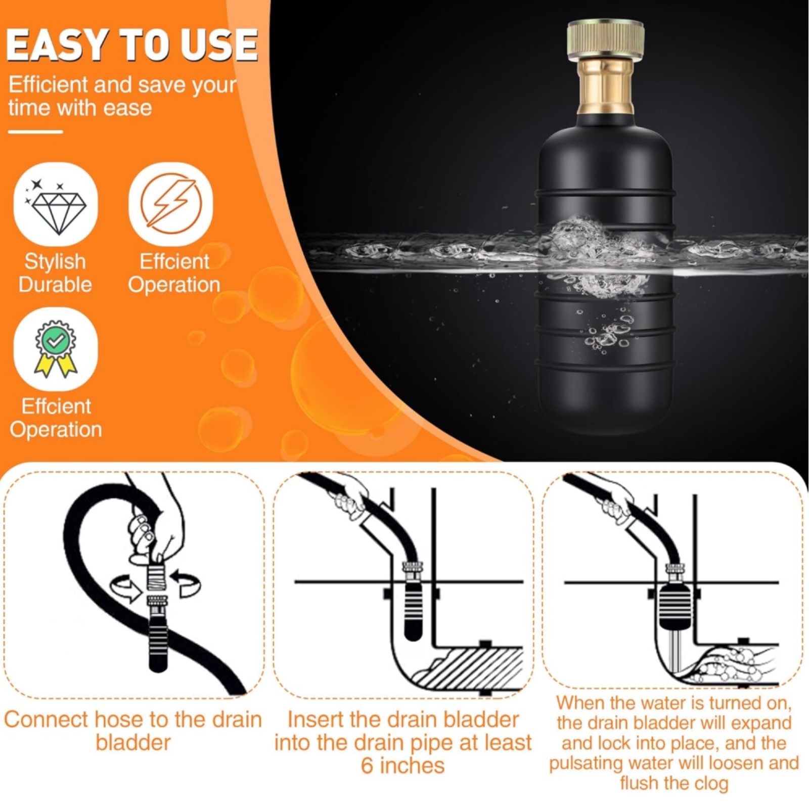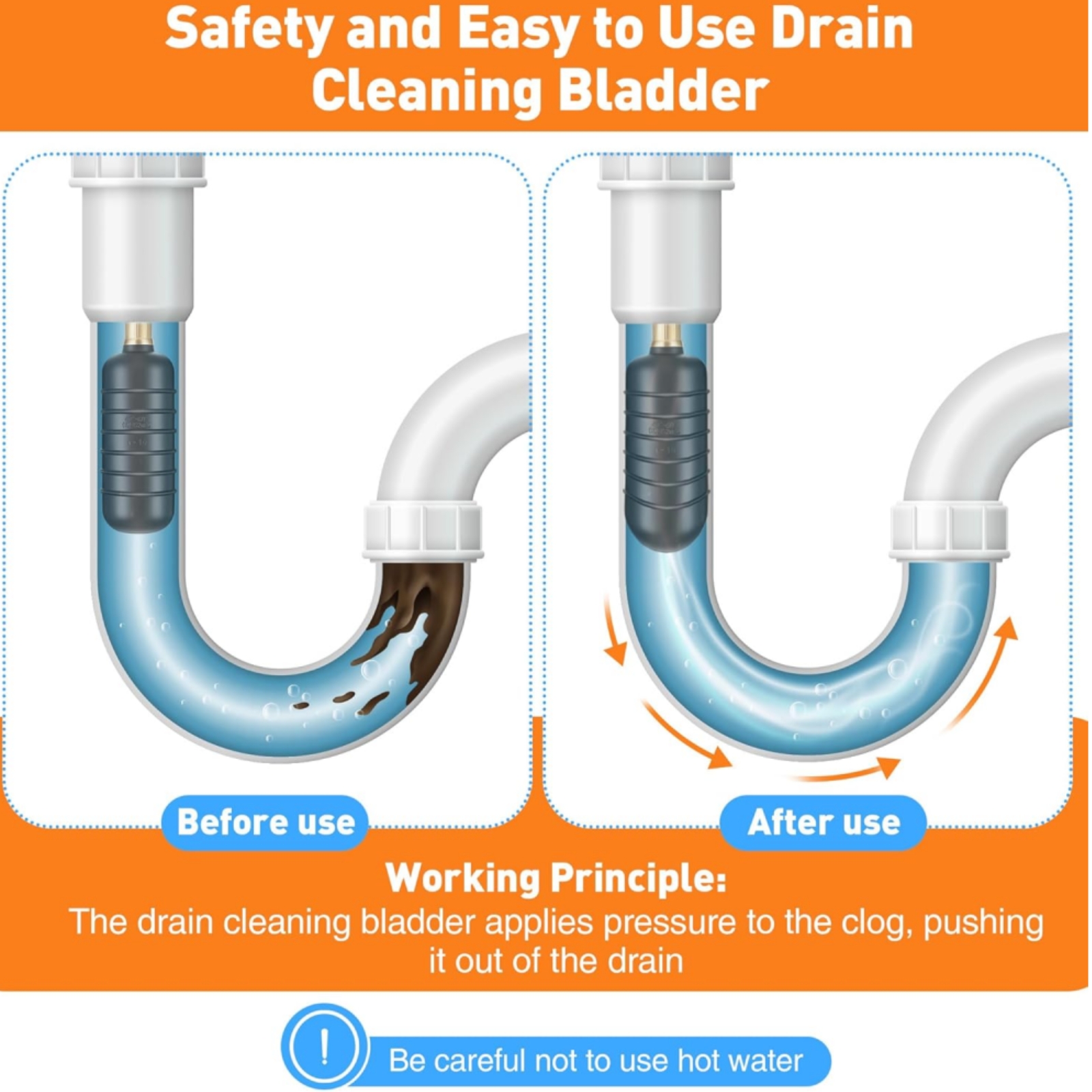 As the bladder inflates, it creates pressure inside the pipe, effortlessly clearing clogs caused by hair, grease, toilet paper, and other debris, restoring proper drainage and saving you time and effort