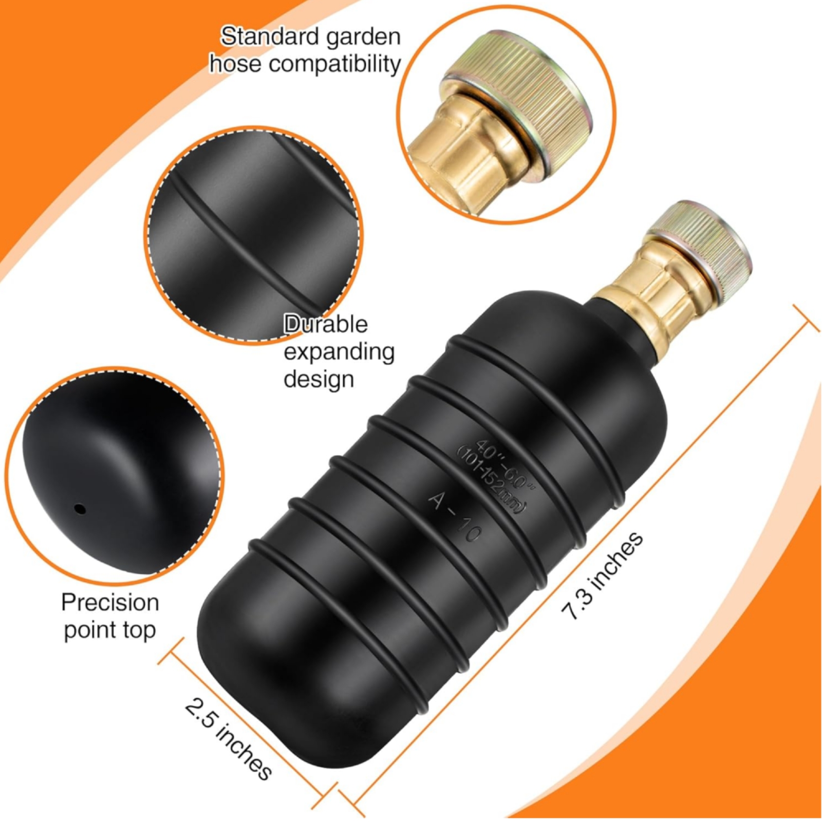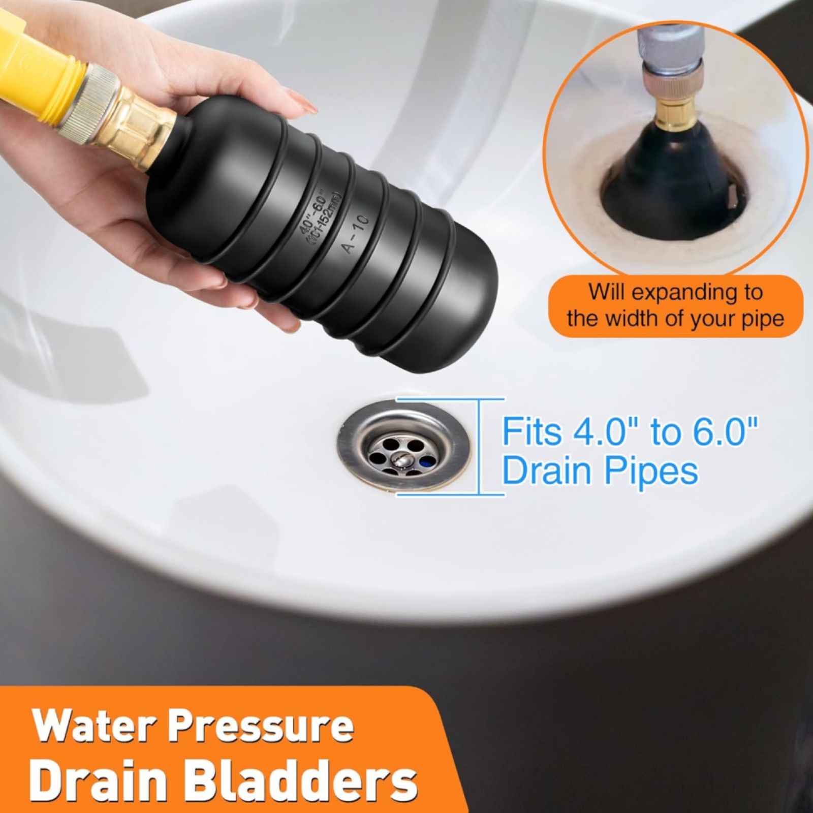 Made of high-quality rubber, the draining rubber bladder is built to withstand frequent use. Suitable for drain openings with diameters ranging from 4" to 6". The water inlet is compatible with most garden hoses or water hoses