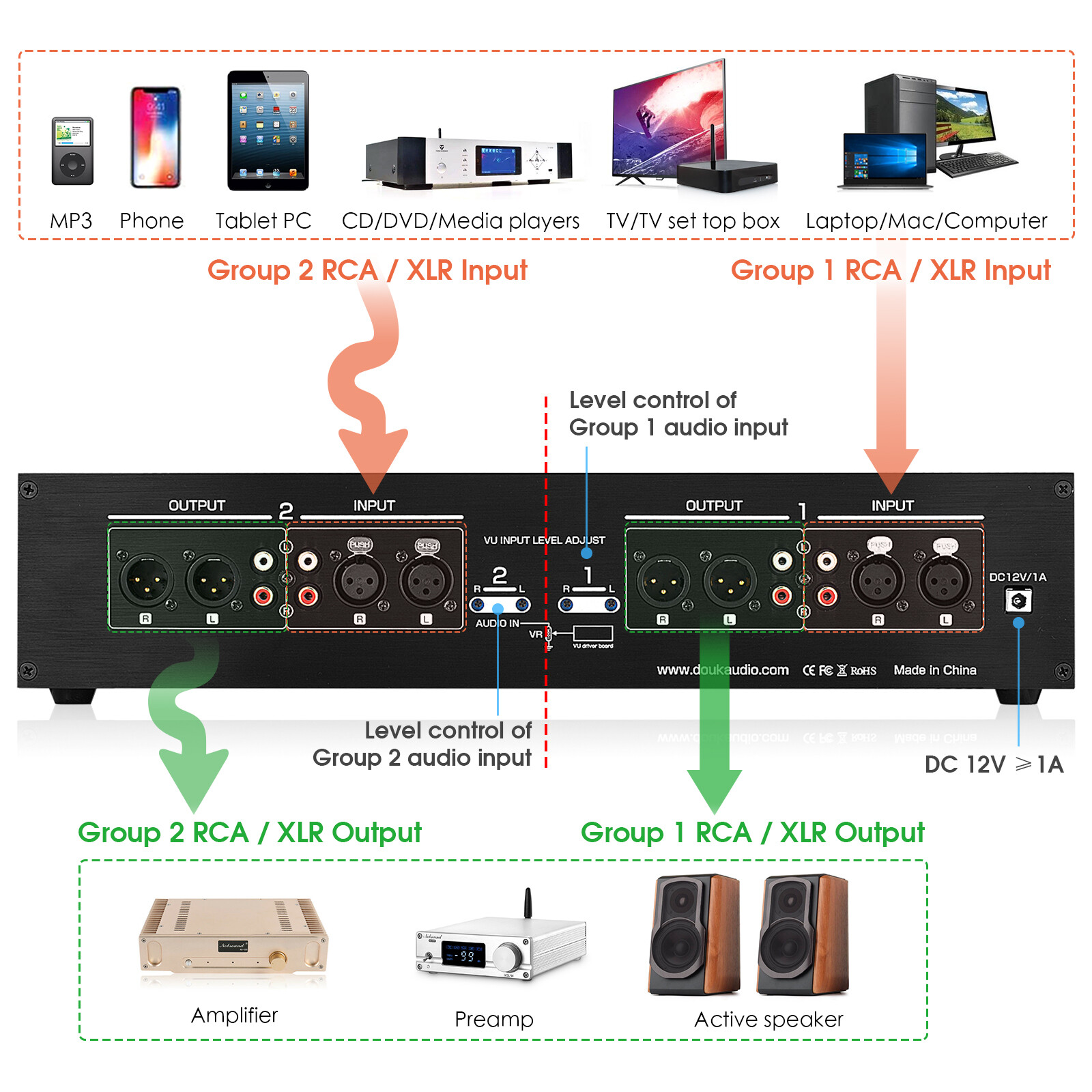 Audio output: 2 groups of stereo RCA / 2 groups of balanced XLR