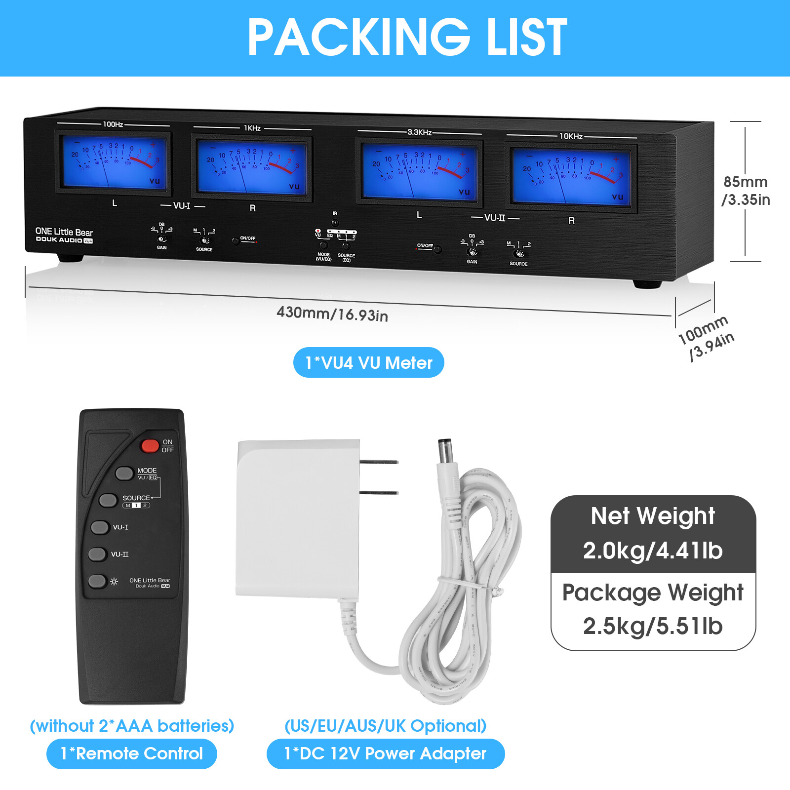 Dimensions(W*D*H):430*100*85mm / 16.93*3.94*3.35in