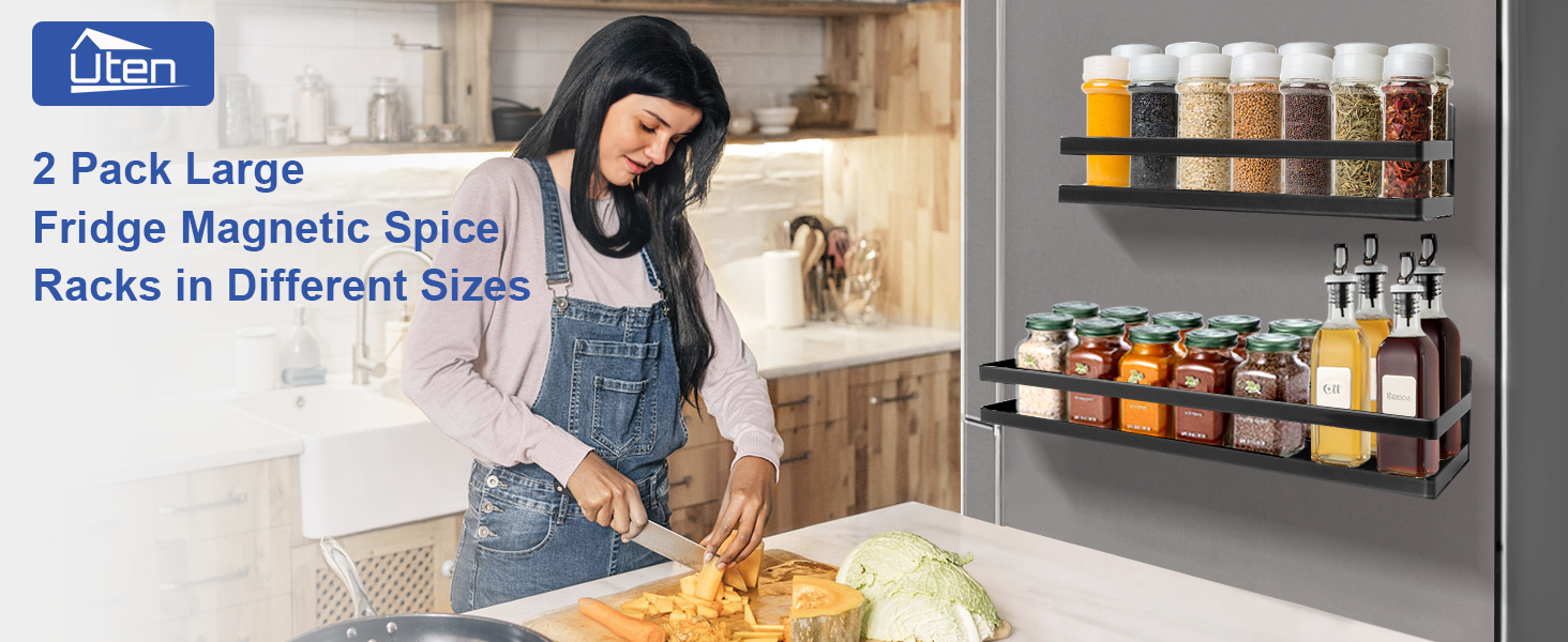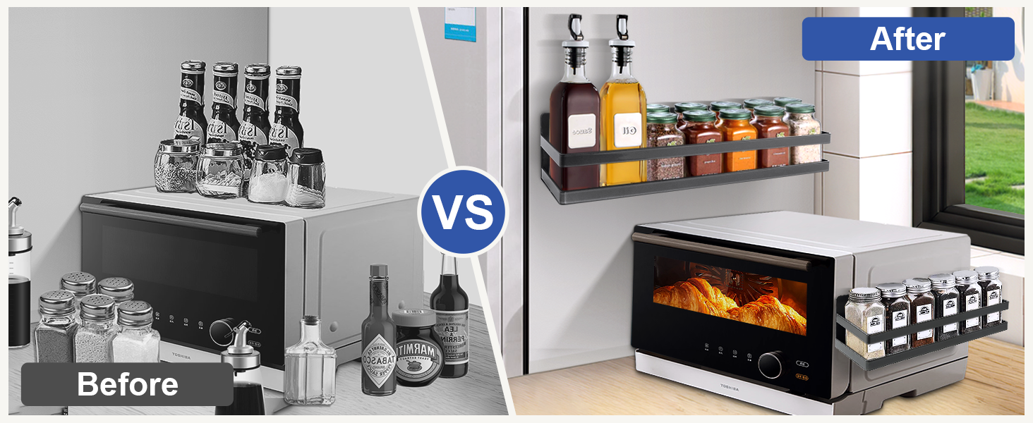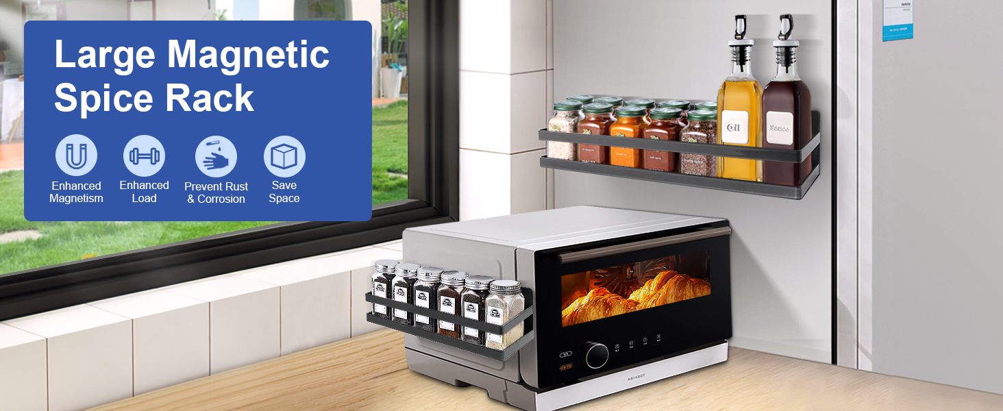 This magnetic shelf is a game changer. Magnetic shelves sits next to your refrigerator. Now you can clearly see all the spices you have, and it's easy to grab what you need from magnetic fridge shelf. No more having to reach into dusty drawers to find the spices you need while cooking. A great apartment must haves kitchen gadgets!