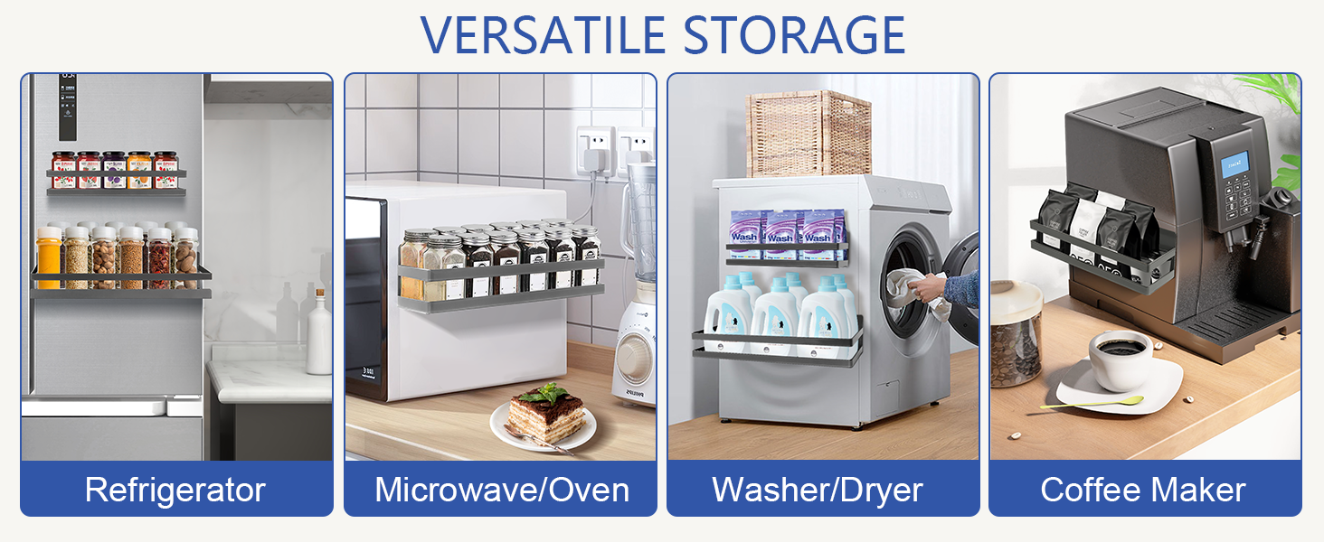 Kitchen spice organizer can store spice, seasoning bottles, jars, and some daily necessities, medicines, etc. The kitchen magnet shelf is not only suitable for the side of the refrigerator, but also a great choice for microwaves, ovens, coffee machines, dishwashers, dryer, classroom whiteboards and other iron surfaces.