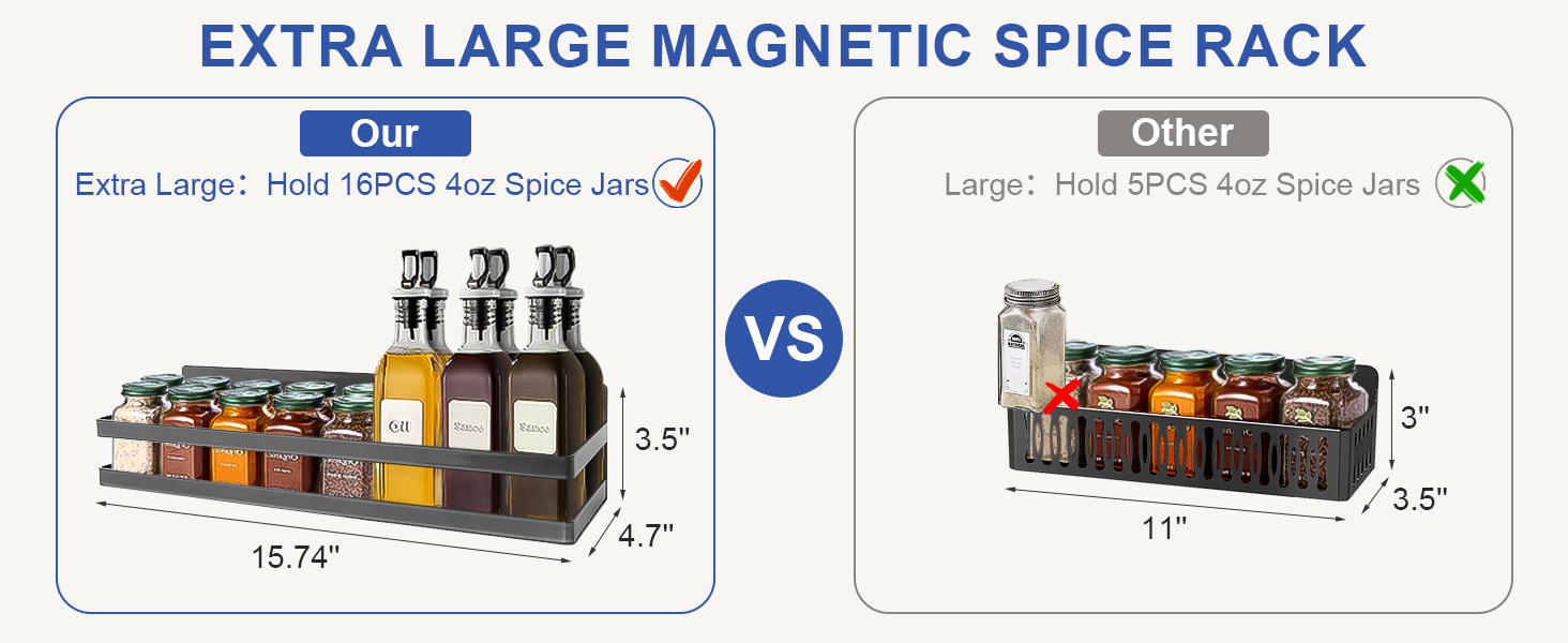 This magnetic shelf for refrigerator is super magnetic and strong enough to support up to 7 pounds of storage weight without drilling or assembly. Just secure spice rack organizer to the side of the refrigerator an which can keep everything in place without slipping or falling.