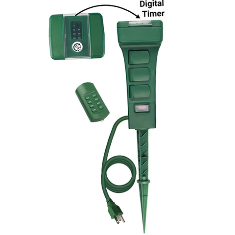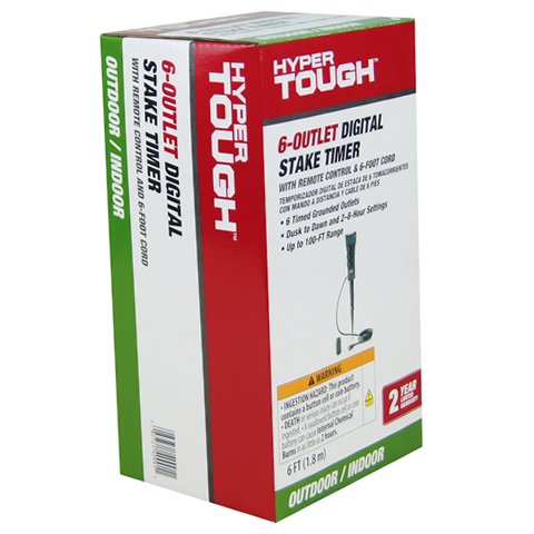The Hyper Tough 6-Outlet Outdoor Wireless Remote Yard Stake controls your appliances up to 100 feet away. This wireless remote yard stake is quick to install without any tools and a simple touch of a button to operate. Multi-timer setting function Dusk to Dawn and 2-8 Hours settings. The six grounded outlets are great for outdoor devices, lights and holiday decorations. This remote kit includes one receiver and one transmitter with a 3-volt Lithium battery (CR2032). This outdoor remote yard stake is suitable for common luminous light accessories, such as CFL, LED, and others and has a UL certification for quality assurance. The Hyper Tough 6-Outlet Outdoor Wireless Remote Yard Stake is a great option to control your applications easily. For outdoor use.