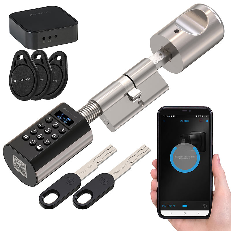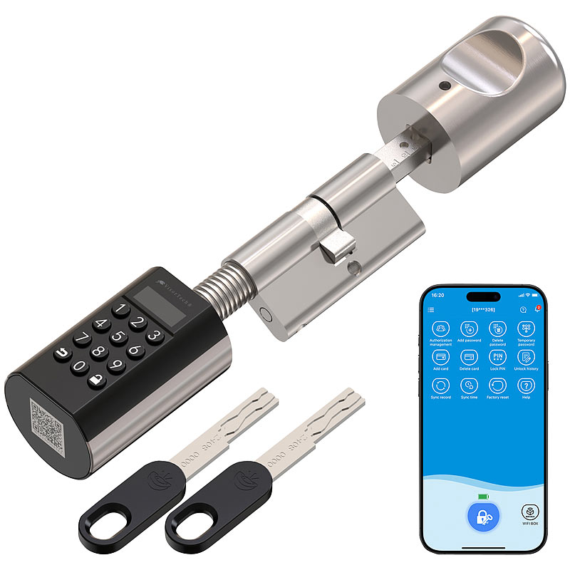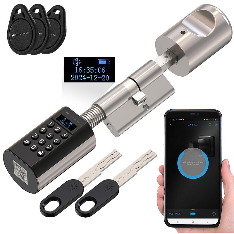 - Smarter, elektronischer Tür-Schließzylinder mit Display: zeigt Batteriestand, Datum, Uhrzeit, Gerätemenü und Eingaben