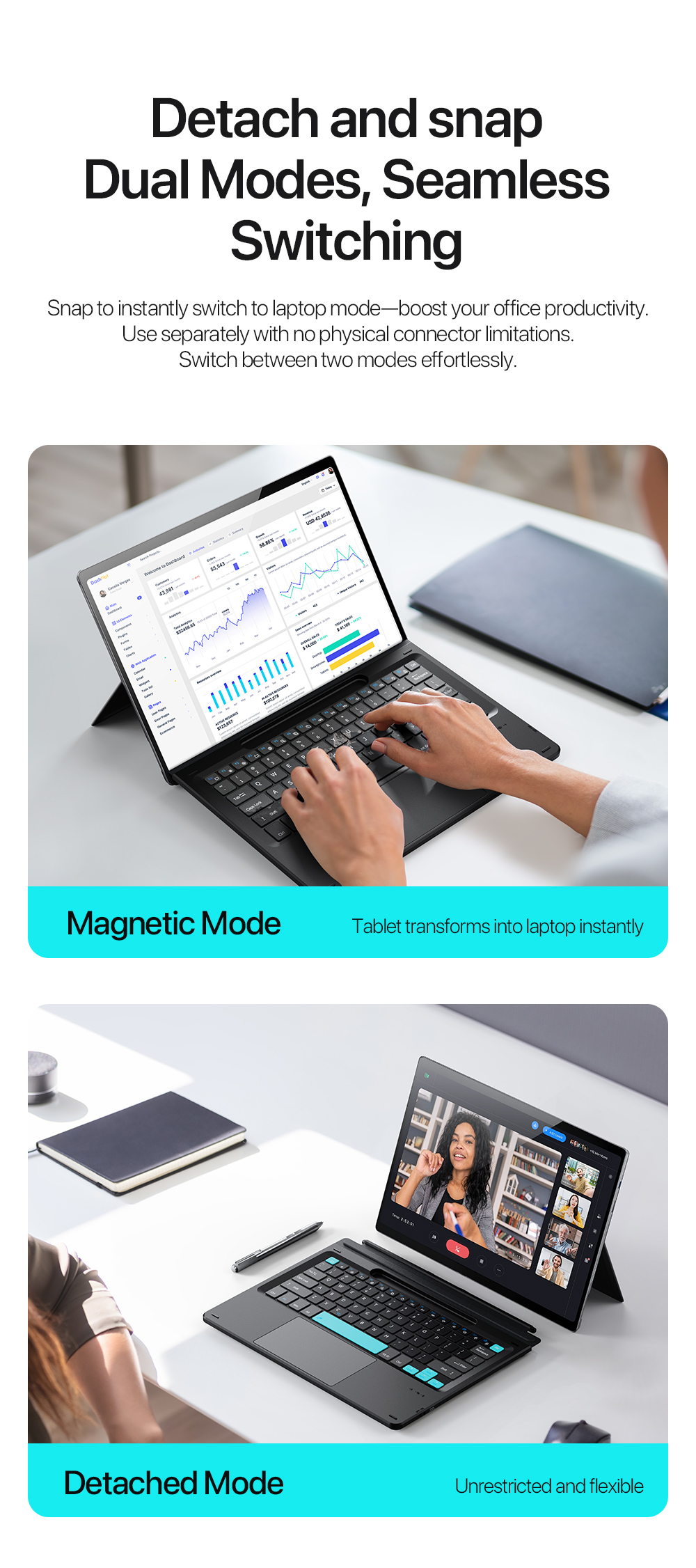 2. Dual modes (magnetic/detached) for seamless productivity and flexibility;