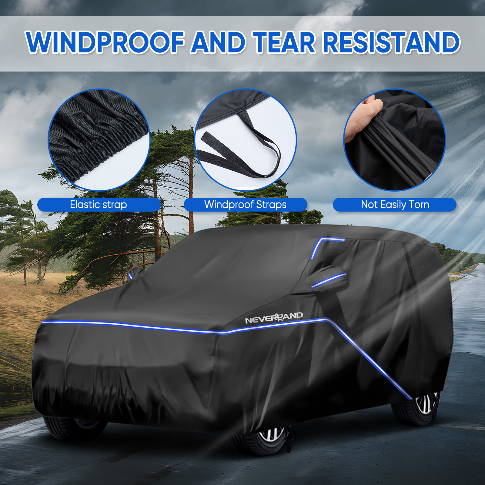【Powerful windproof design 】---Elastic bands front rear and 4 wheel straps can help you tighten the car cover and protect your car cover in heavy wind from blowing off.