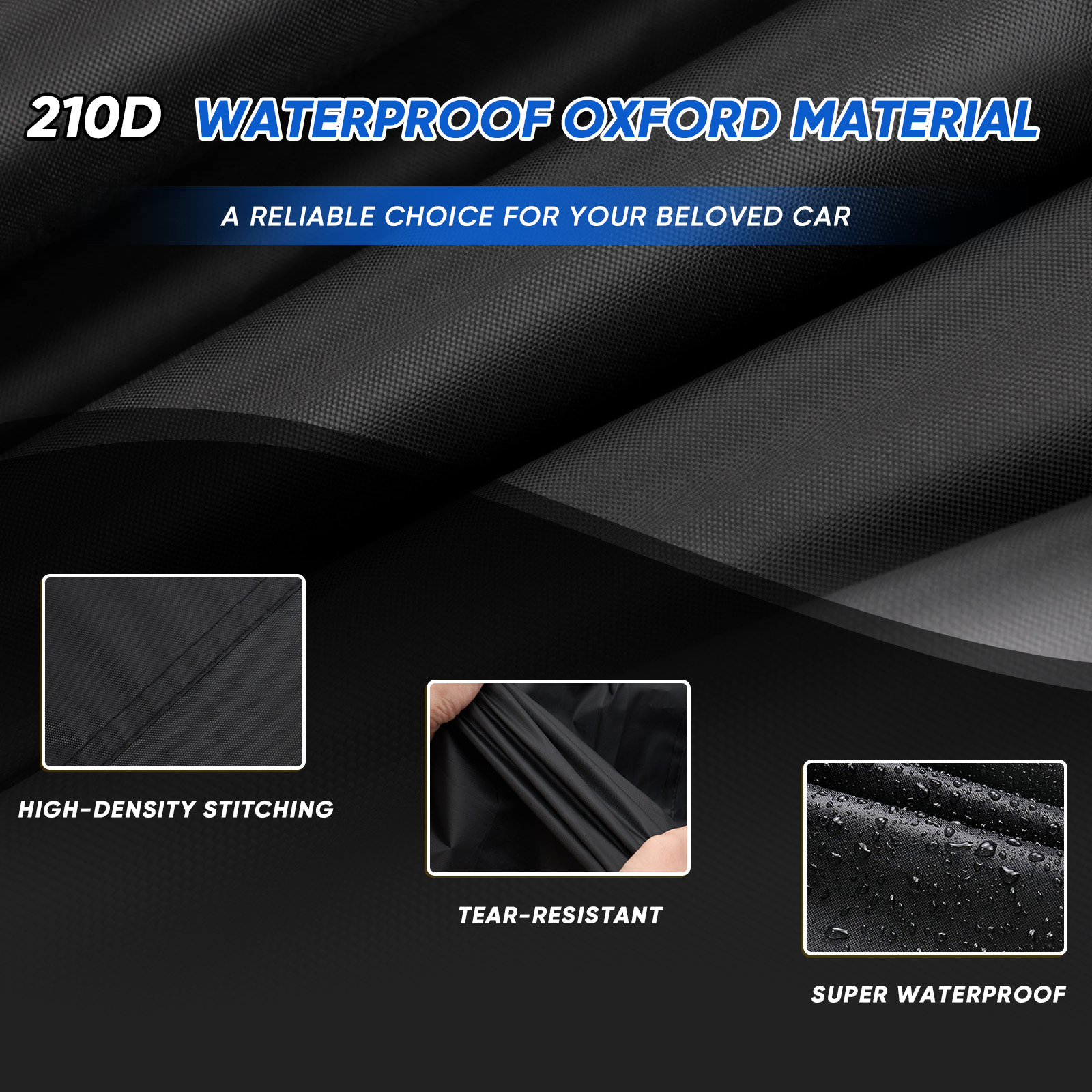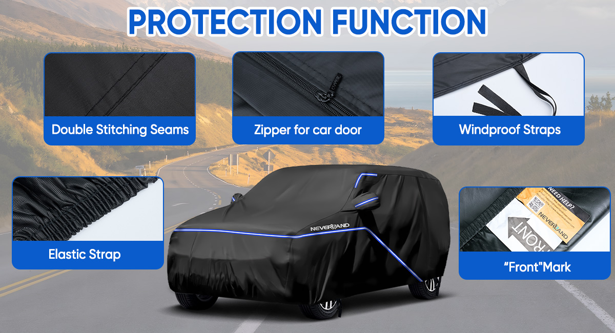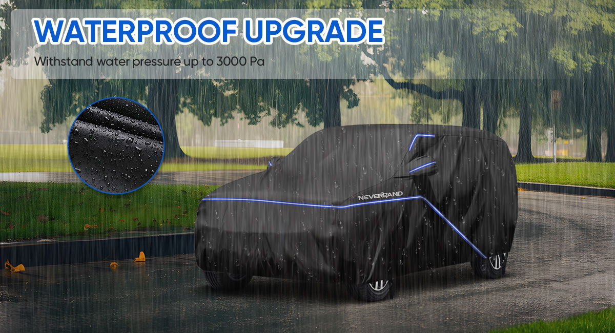 【210D oxford with PU coating】---We use high-quality 210D oxford with PU coating,waterproof water pressure is 4500mm.Our car cover is not only excellent in waterproof performance, but also can prevent snow, rain, dust, scratches, etc.