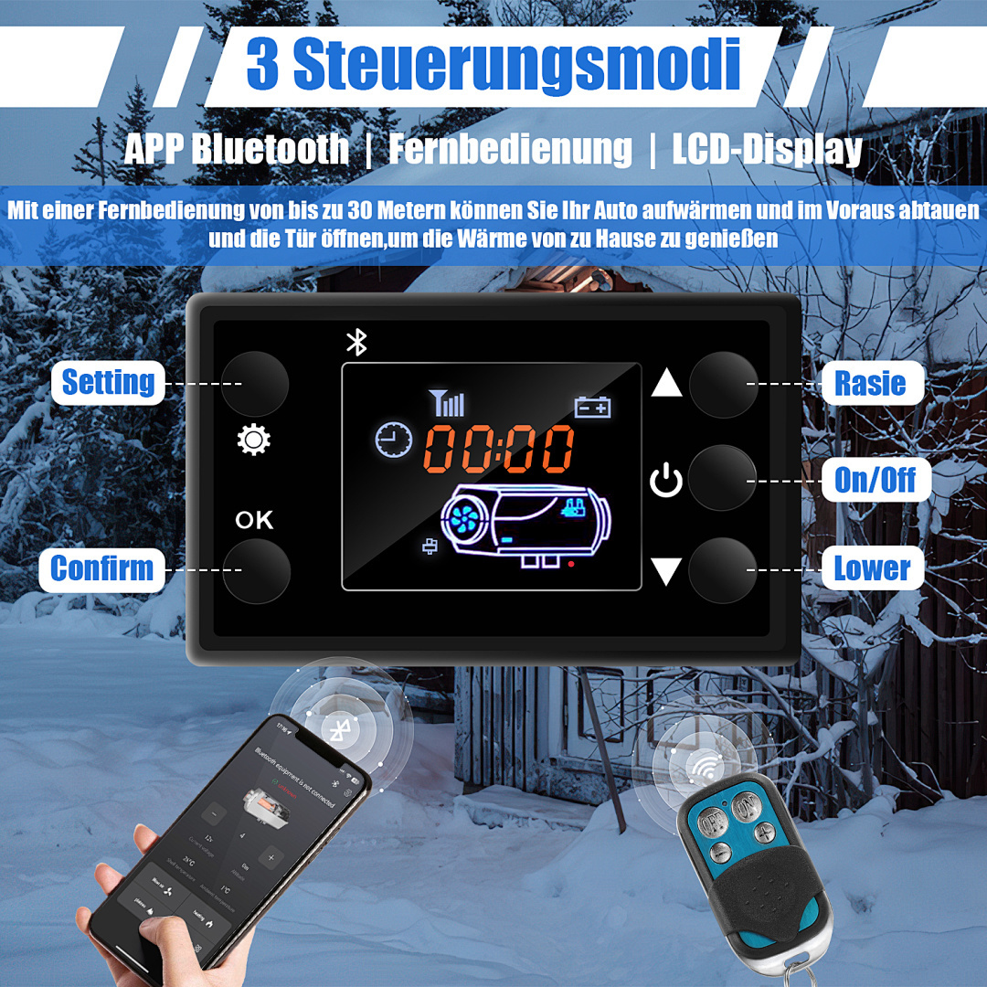 🔥 Intelligente Steuerung: Ausgestattet mit einem LCD-Display und Bluetooth-Steuerung über das Smartphone, ermöglicht es Ihnen, das Fahrzeug fernzuvorheizen und die Temperatur einzustellen, mit einer Reichweite von bis zu 30 Metern.