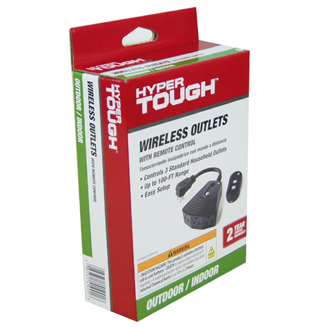 The Hyper Tough 3-Outlet Outdoor Wireless Remote controls your appliances up to 100 feet away. This wireless remote control is quick to install without any tools and a simple touch of a button to operate. The three grounded outlets are great for outdoor devices, lights and holiday decorations. This remote kit includes one receiver and one transmitter with a 3-volt Lithium battery (CR2032). This outdoor remote control is suitable for common luminous light accessories, such as CFL, LED, and others and has a UL certification for quality assurance. The Hyper Tough 3-Outlet Outdoor Wireless Remote Control is a great option to control your applications easily. For indoor and outdoor use.