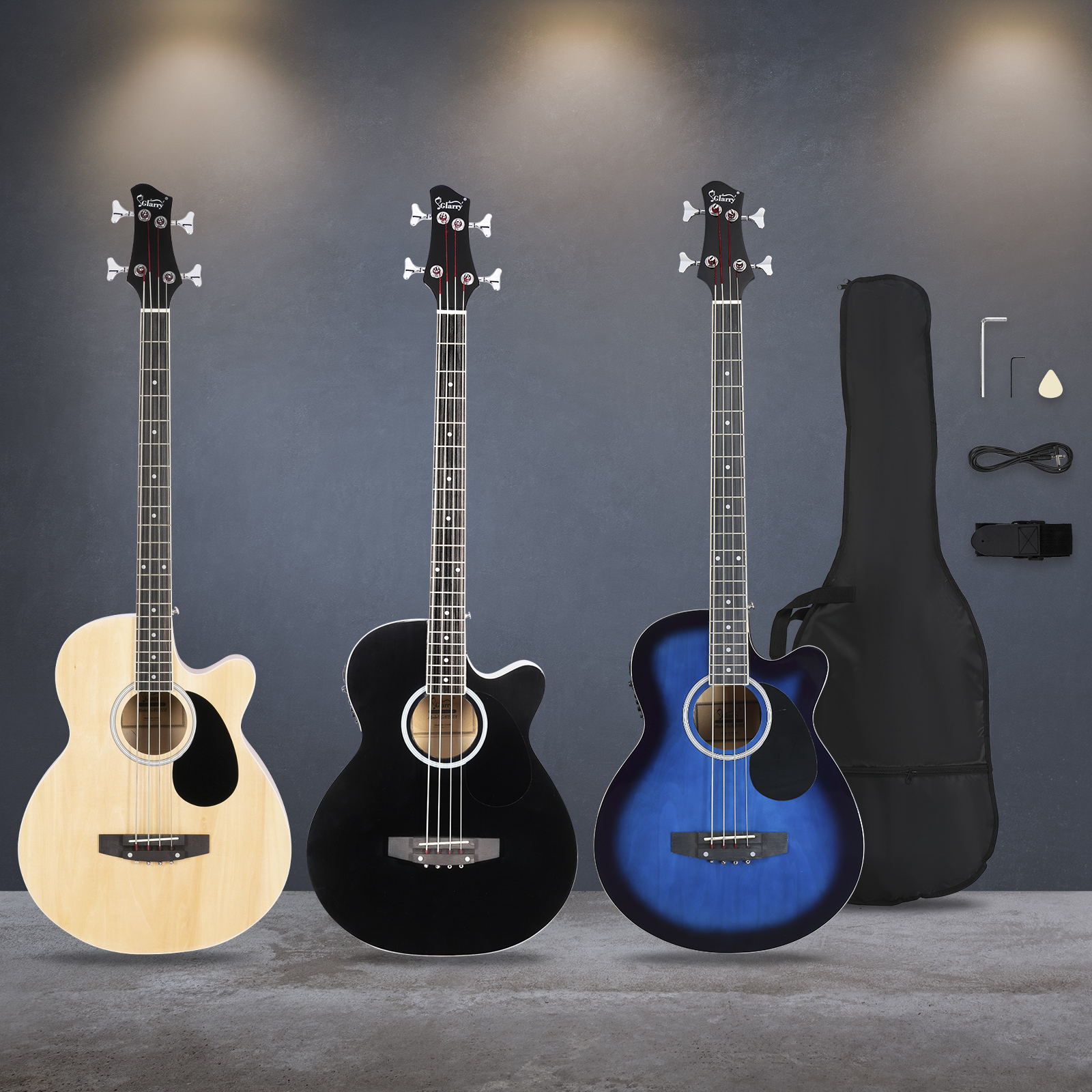 4. The set Includes: Aoustic Bass Guitar, Bag, Cable, Wrench adjustment tool,Strap, Plectrum. 9V battery not included.