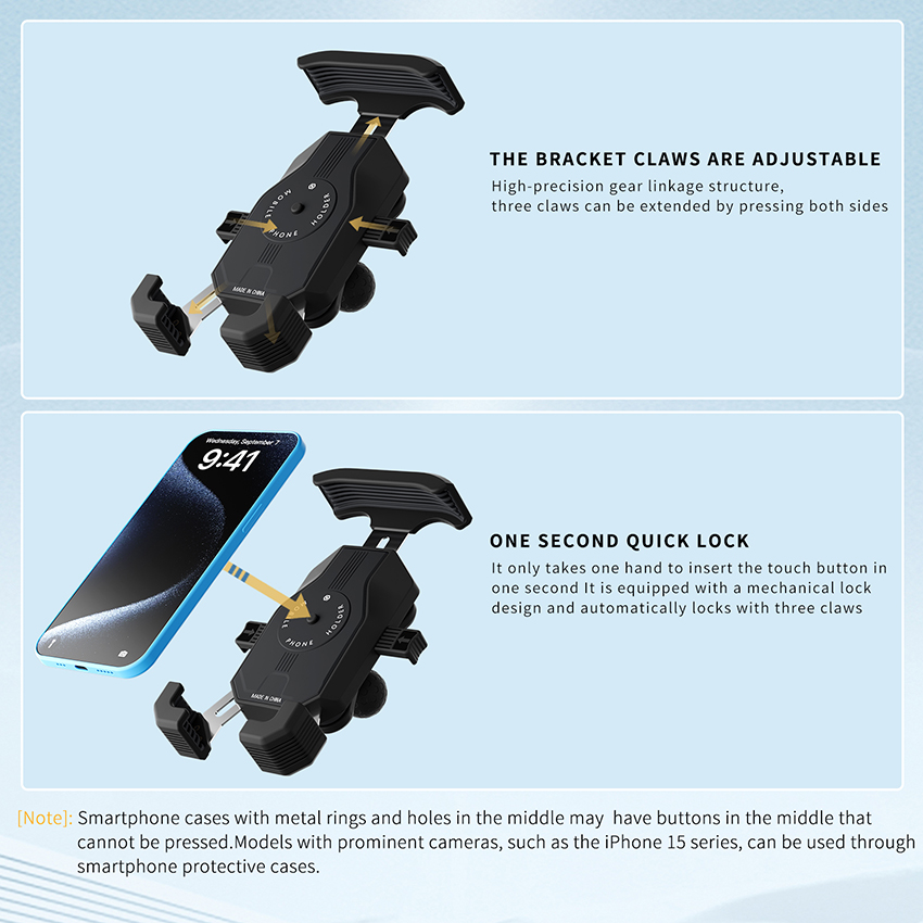 l Three claws locking, with mechanical lock design, the phone will ask lock [anti-vibration protection] to prevent your phone from scratching and vibration
