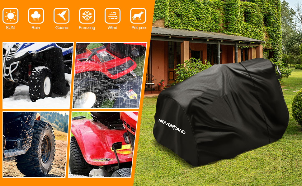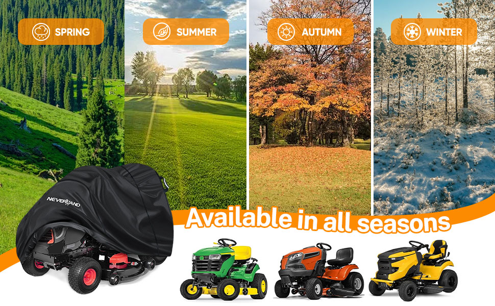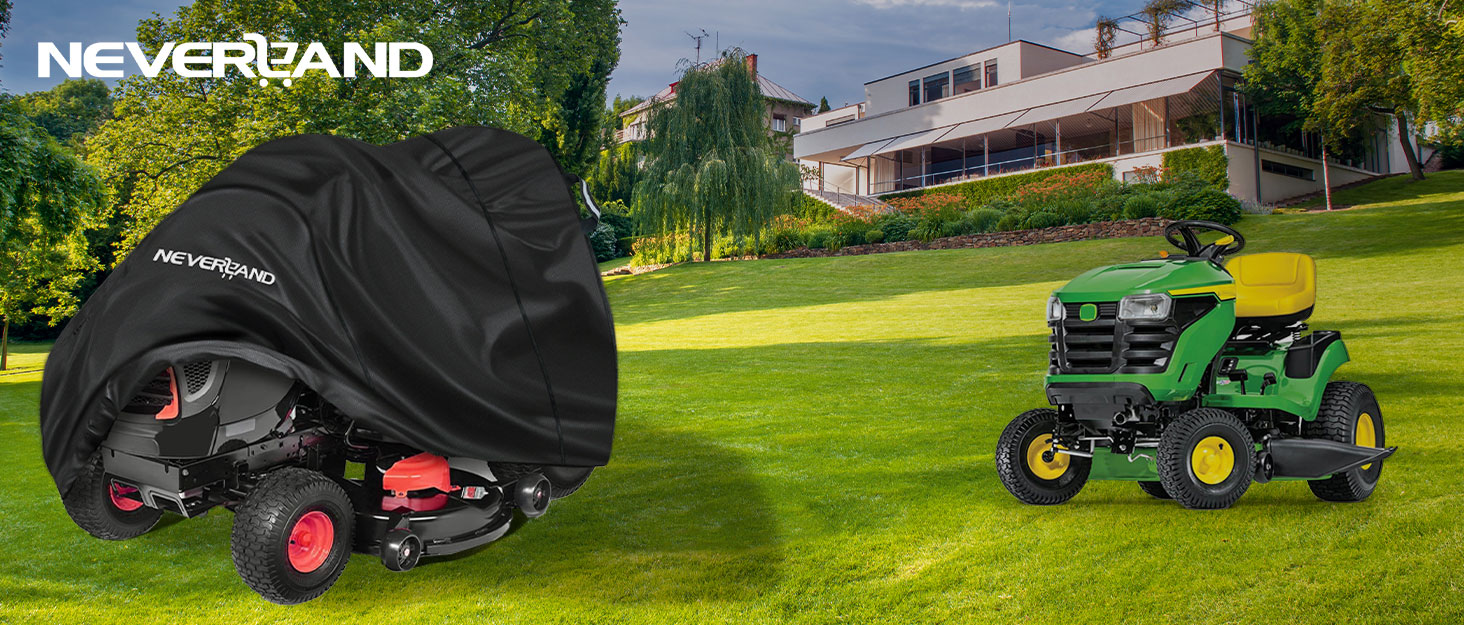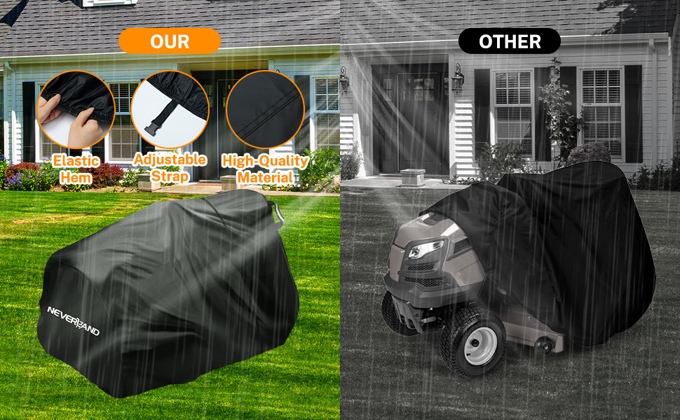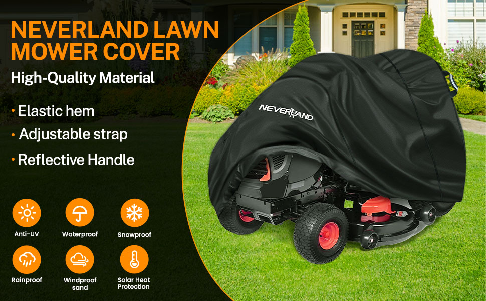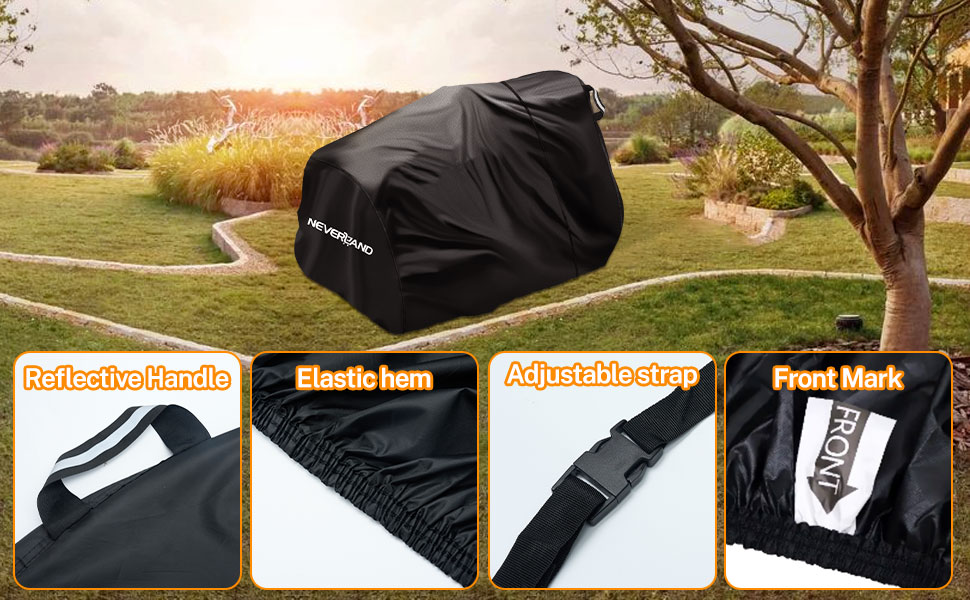 【Reflective Handles & Easy-to-use】NEVERLAND riding lawn mower cover have reflective handles on the sides, which is necessary for night-time identification, enhancing parking safety. And our lawn mower cover is easy to put on, protect your lawn mower from the sunlight, rain, snow, dust, leaves, debris and bird droppings etc.
