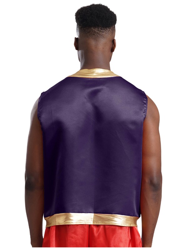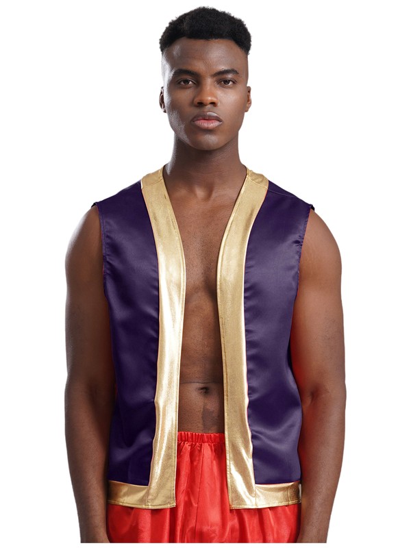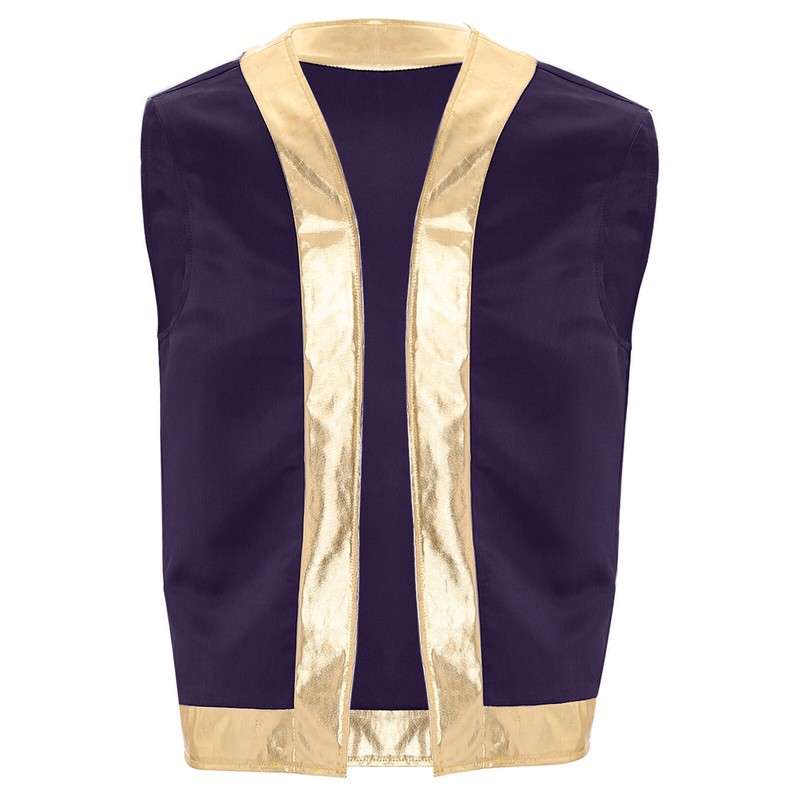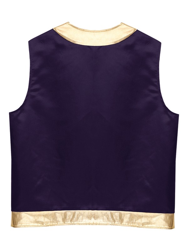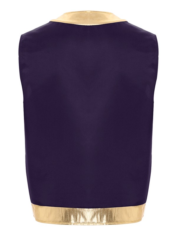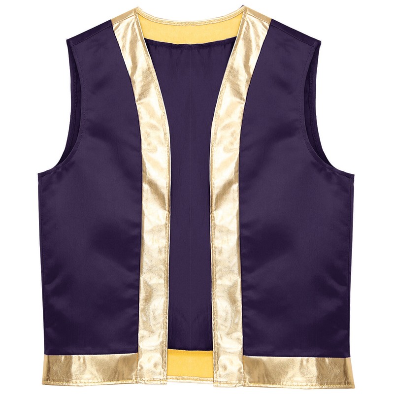 Designed with open front, sleeveless, stylish metallic shiny trim and loose fitting, contrast vest is a perfect costume for cospaly party.