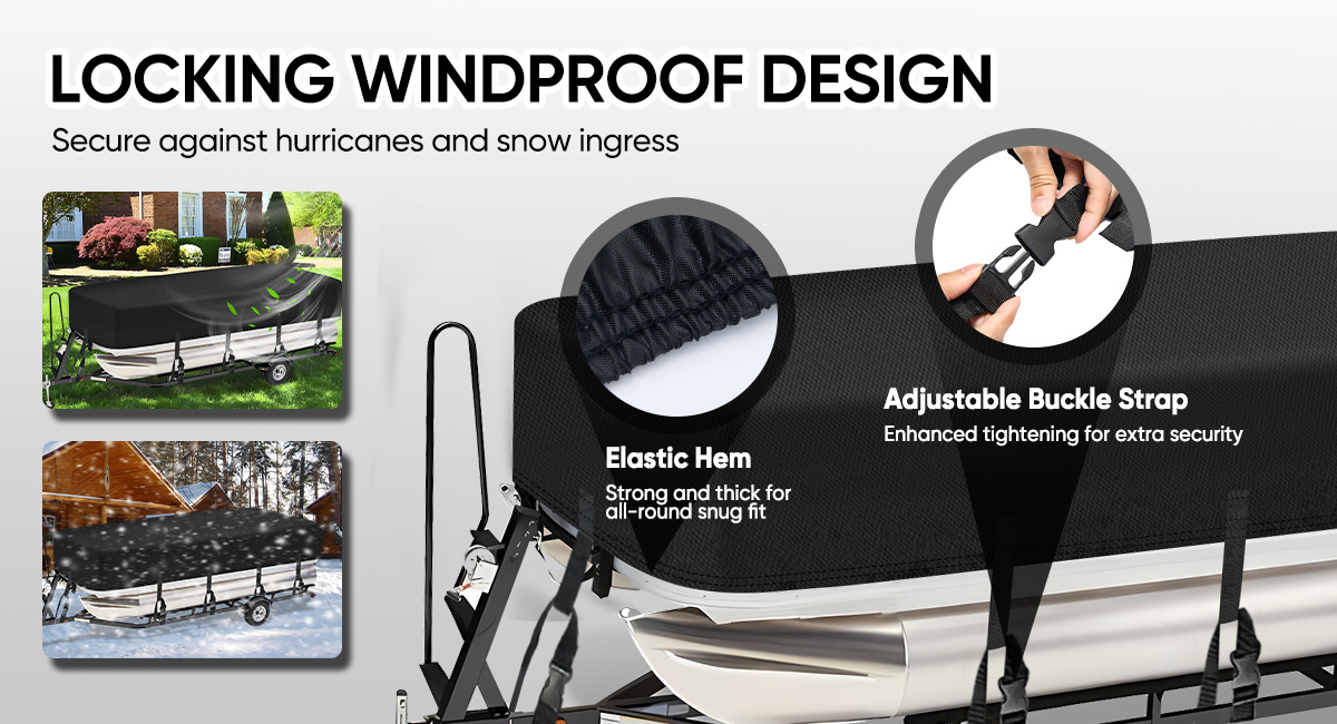 【All-Round Protection】Bass tracker boat cover equipped with 10 adjustable straps and quick-release windproof buckles, elastic cords around the bottom edge ensure a tight fit, which allow you to conveniently lock the cover with your boat and prevent it from being blown away, perfect for both trailering and outdoor storage