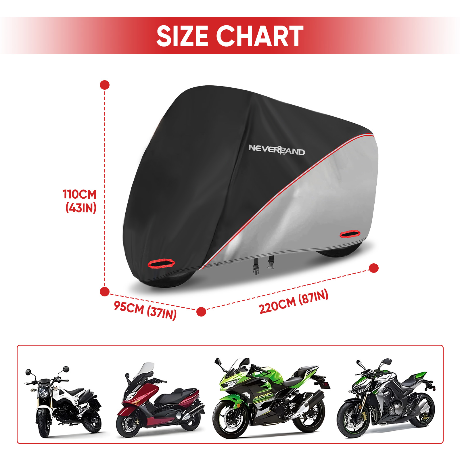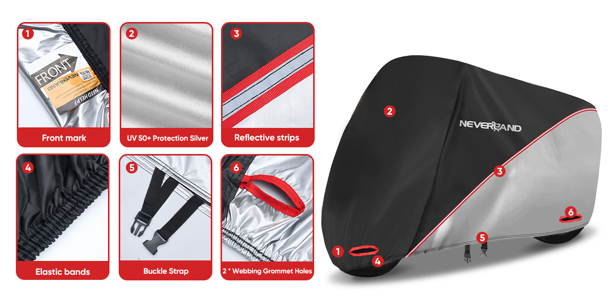 【Extended Reflective Strips】 - There are two extra long reflective strips around the motorcycle body. Waterproof motorcycle cover improves safety when parking at night. Adjustable straps, reinforced buckles, strong windproof ability.