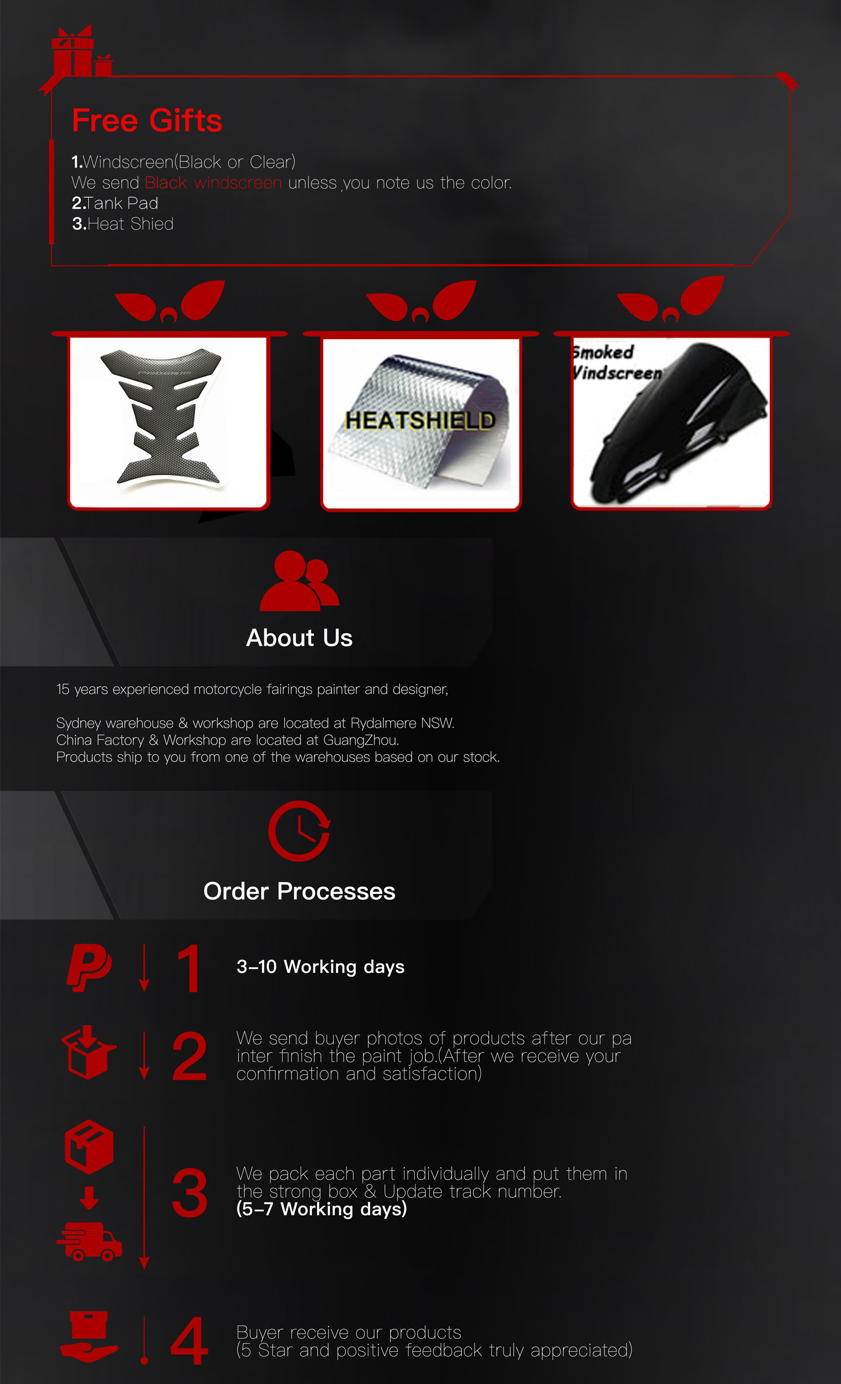- Material: High quality ABS plastic, good elasticity and heat tolerance, not easy to be cracked. Use same grade OEM bodywork fairing kit ABS raw material.