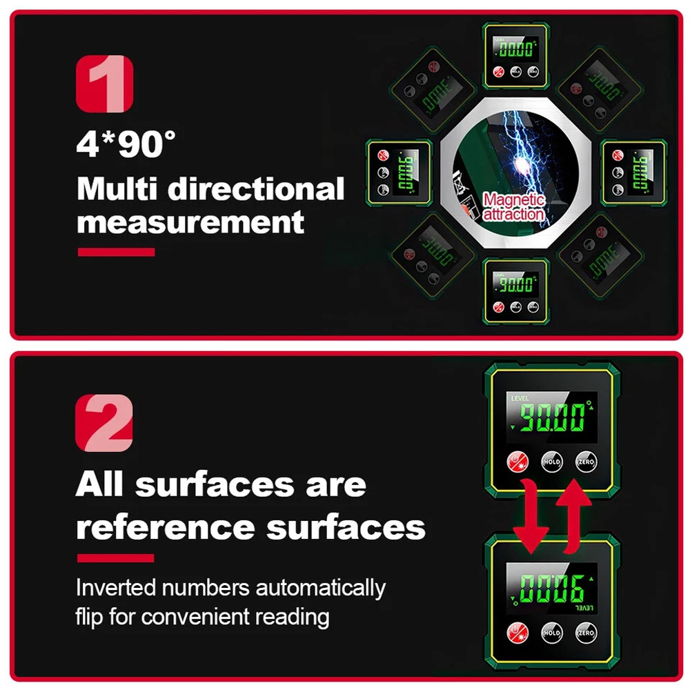 3.Auto Shut-Off & Clear LCD Display: The LCD display automatically flips for easy reading in any direction and powers down after 30 seconds of inactivity, conserving battery life and boosting energy efficiency in level angle gauge.