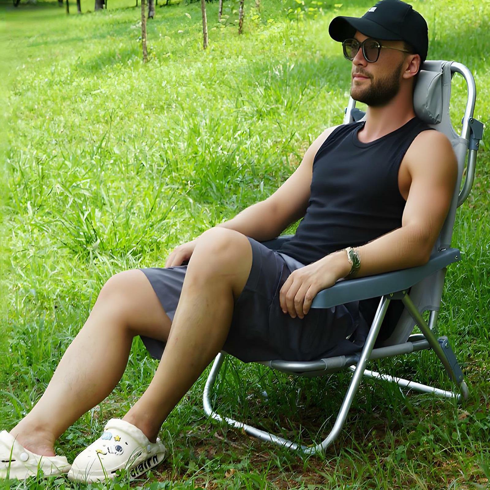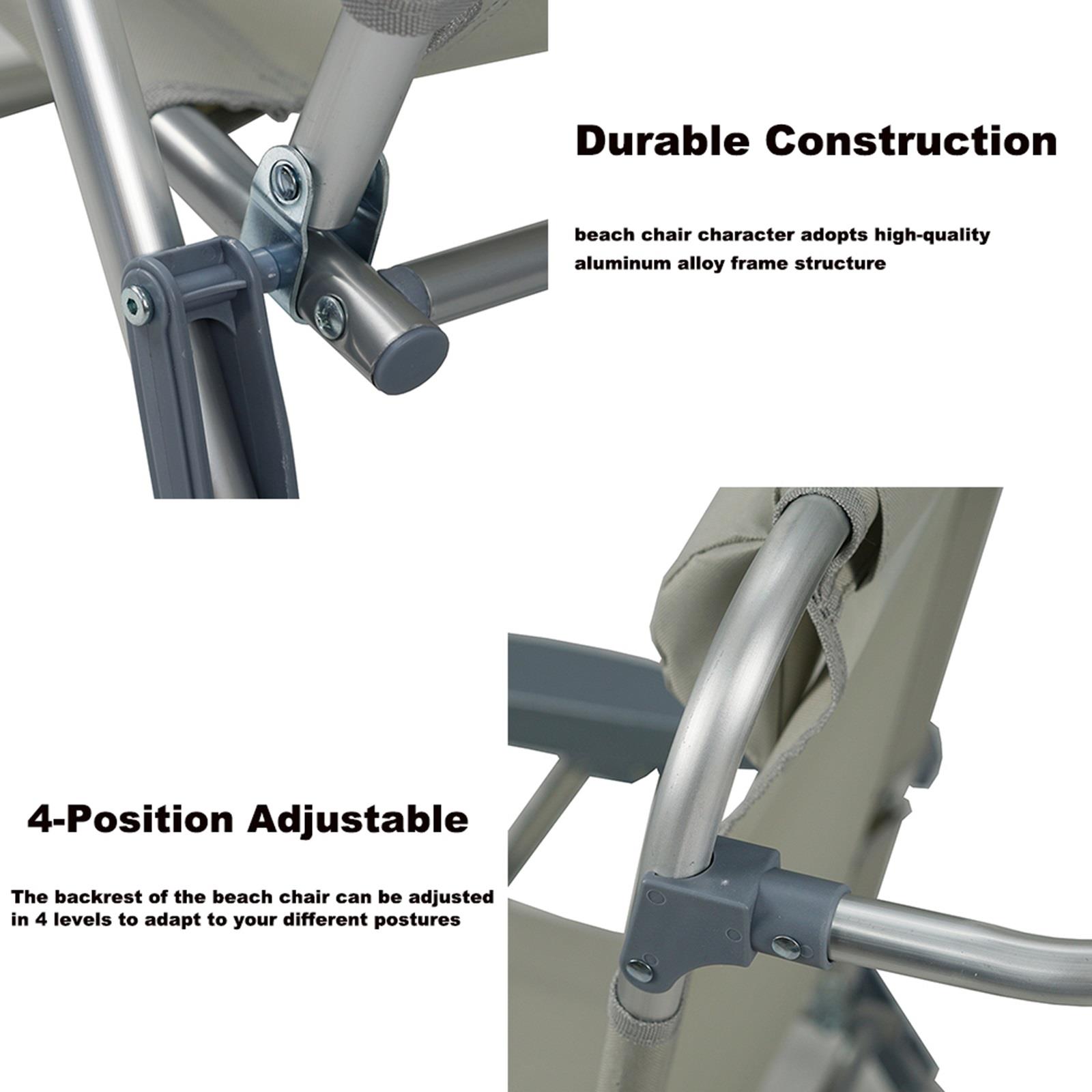 4-Position Adjustable: The backrest of the beach chair can be adjusted in 4 levels to adapt to your different postures. It can be used as a deck chair, reclining chair, or beach seat; pillow design and widened plastic armrests can support the head and arms; the front and rear leg horizontal tube design, provide you with extra stability.